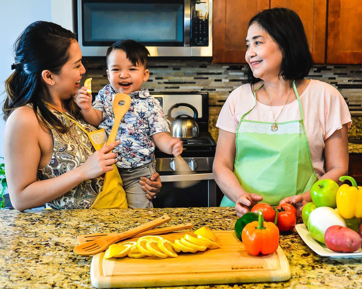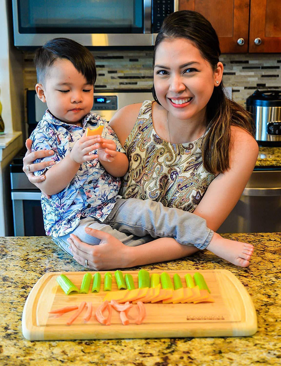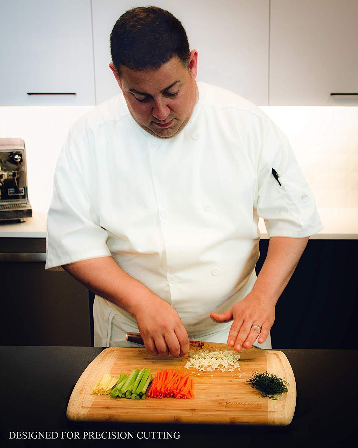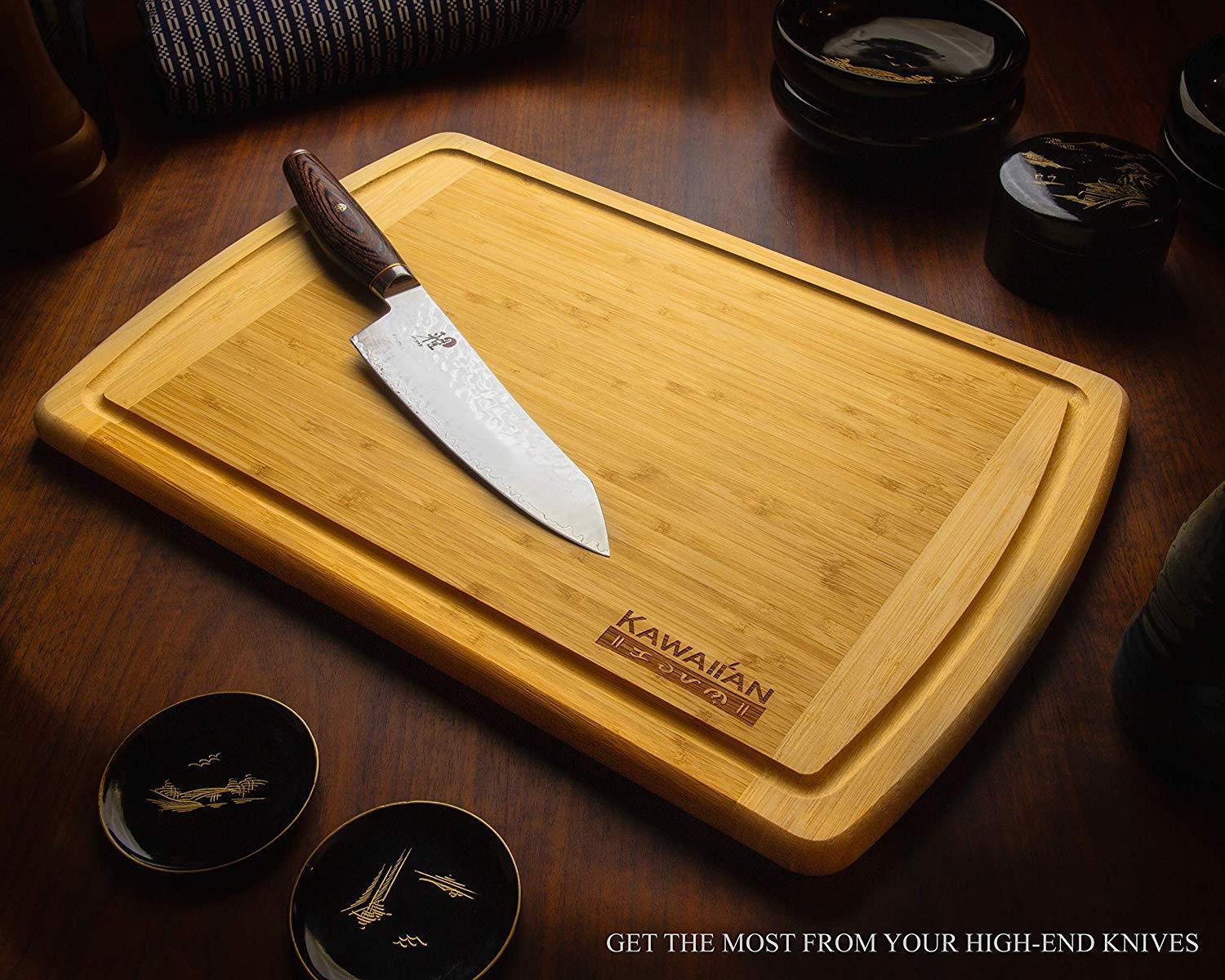 SLICE WITH PRECISION on our high quality bamboo cutting board; The parallel, edge-grain fibers give the control you need for uniform cuts— get the most out of your professional chef knives and santoku blades CHOP LIKE A MASTER because our cutting board is heavy duty; It feels more substantial than other boards, and its dense bamboo surface is more resistant to deep scars where bits of food like to hide PLATE LIKE A PRO on this photo and post-worthy serving platform, made from beautiful and naturally finished bamboo; Its rounded edges and corners are gentle to the touch, and will also keep your guests smiling SAFE & EASY CLEAN UP with its deep outer groove that catches drips and crumbs; Bamboo is less porous than wood, making it easier to wash and dry faster; It’s also BPA free, formaldehyde free, and unvarnished, so it’s safe for your whole family DEPEND ON IT FOR LIFE because your purchase is backed by our manufacturer 30 day Money Back Guarantee with a Lifetime Replacement Warranty; If it splits, chips, cracks, or warps, we will replace it free of charge