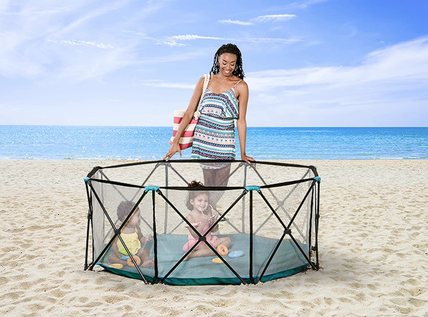 PERFECT FIT: The nylon bottom provides protection from rough surfaces. The My Play 8-panel measures 62 inches wide and 26 inches tall. Patented easy fit, one-time adjustment system.