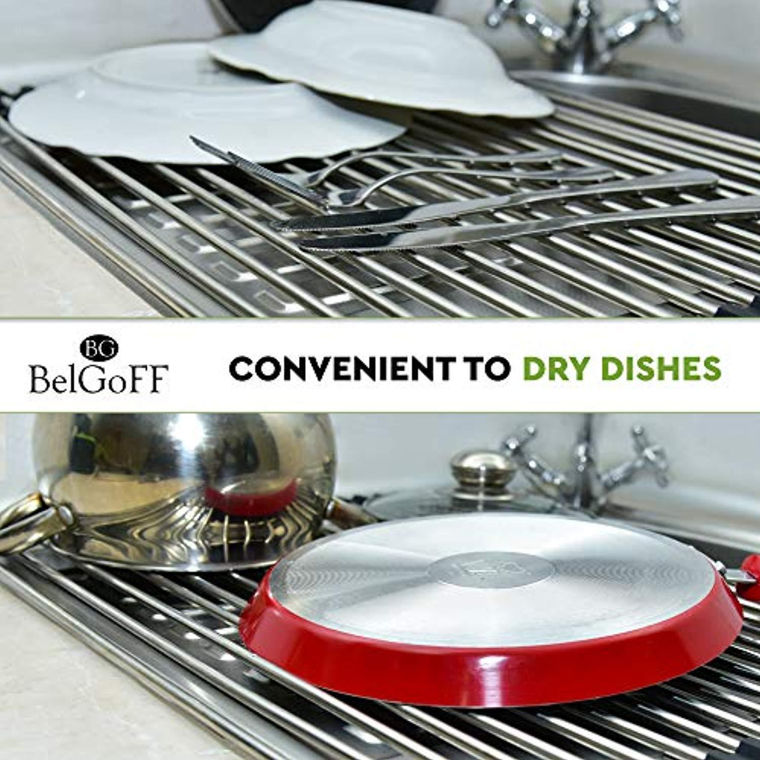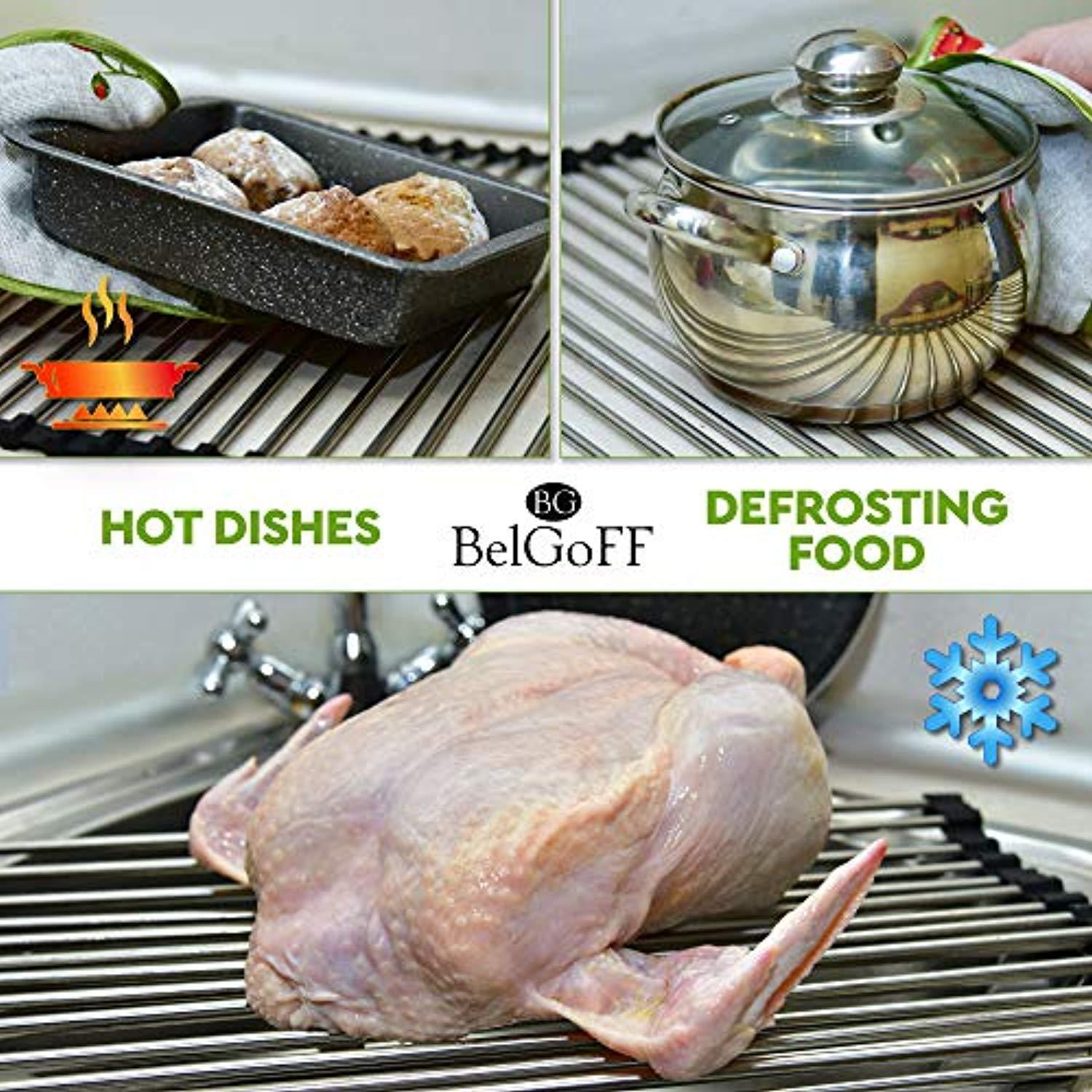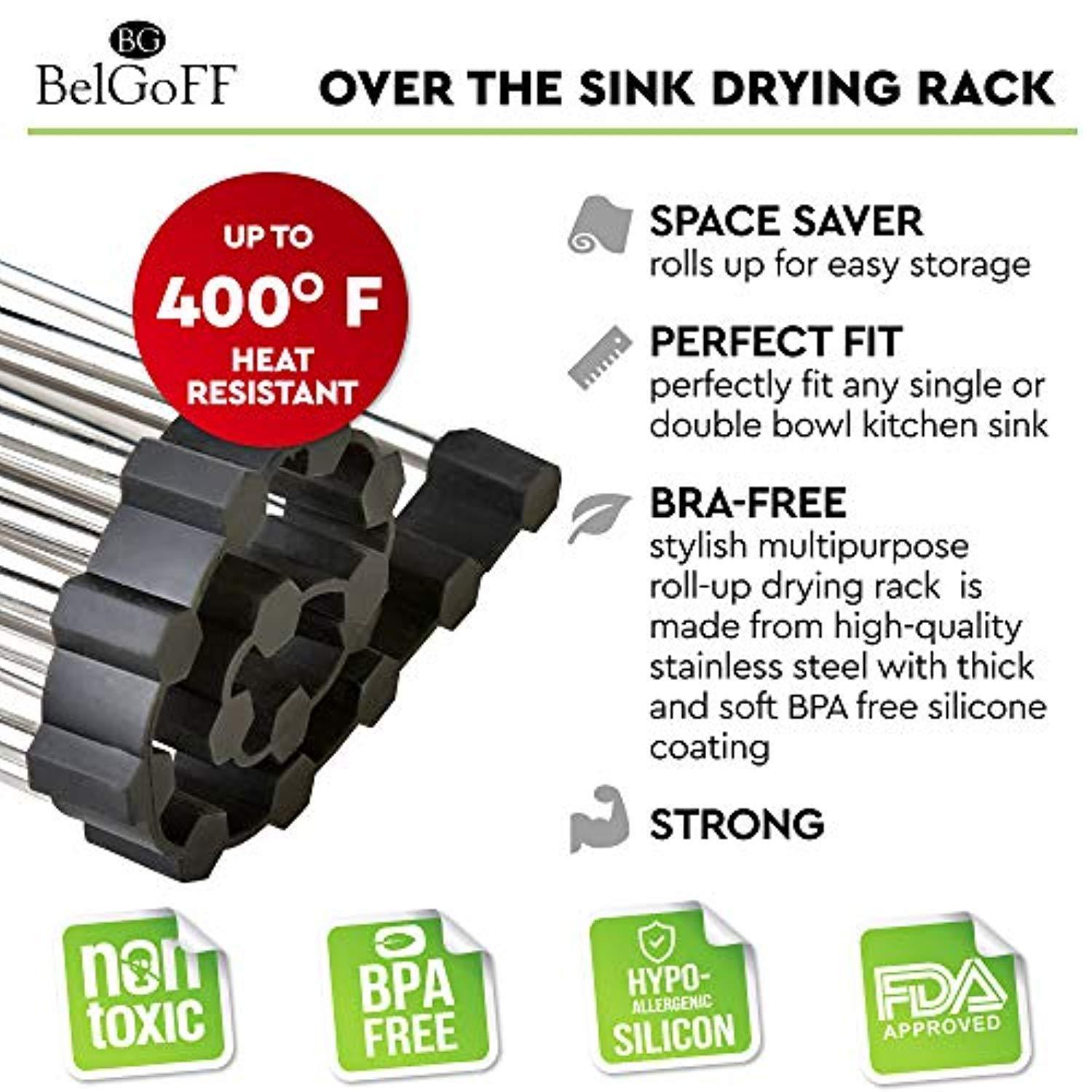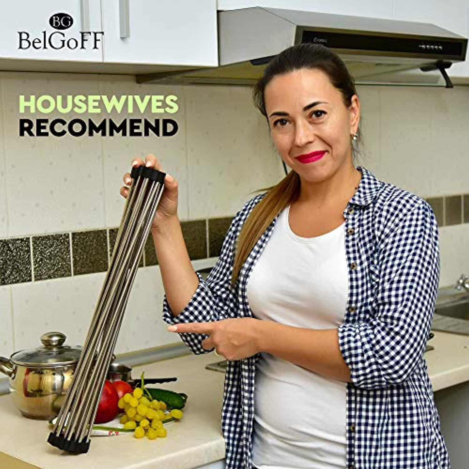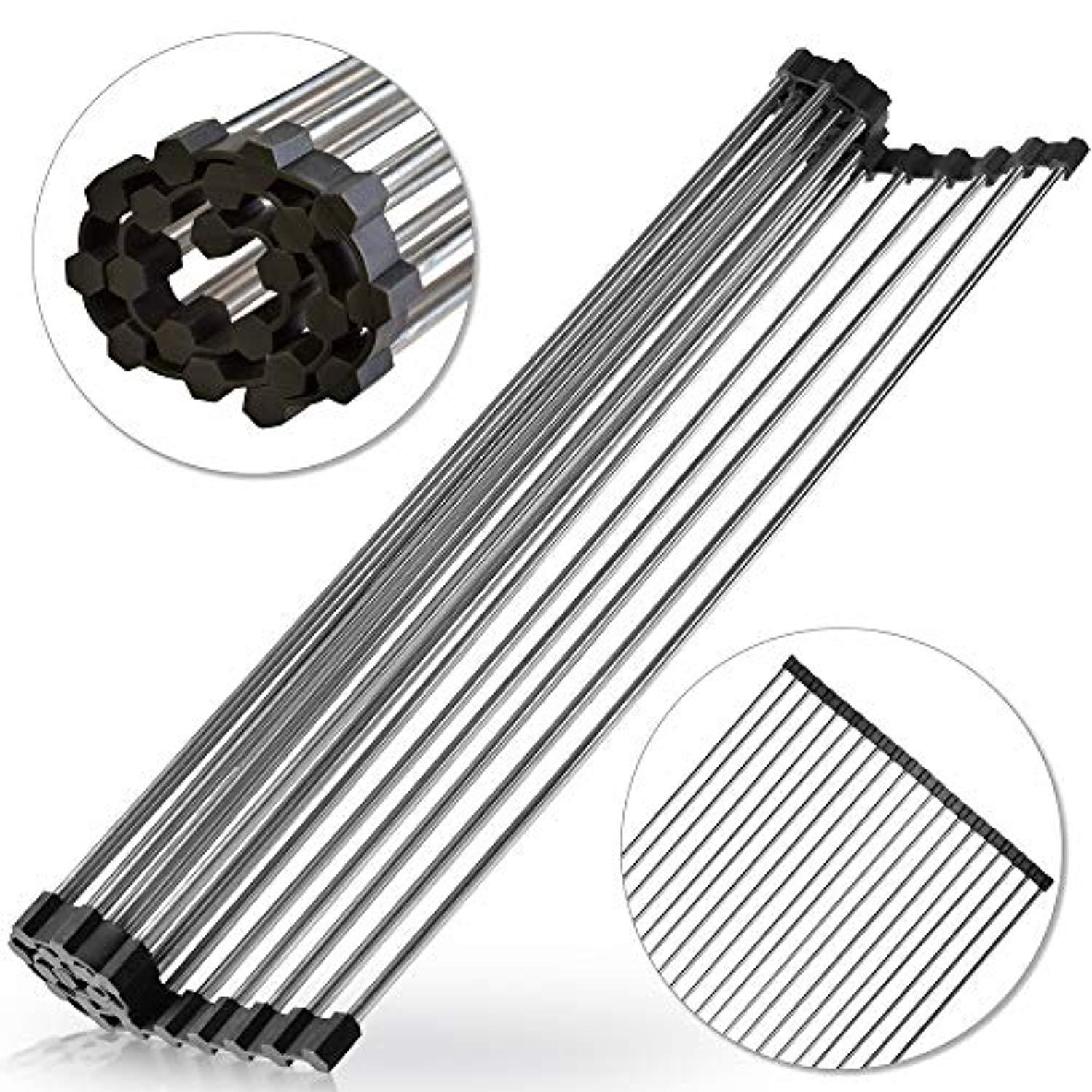 MULTIFUNCTIONAL - The roll up dish drying storage rack holder can be used not only for drying kitchen utensils but also be a colander, a preparation desk put over the sink or a trivet for hot bowls to put on. For water drain and storage purposes. HIGH QUALITY - The kitchen sink draining rack is made of food grade stainless steel rods with silicone rubber which guarantees its long life and makes the rack organizer durable and non-slip. CONVENIENT HOLDER - The silicone fringe drying rack strainer board fits most of sinks, can be cut in two if you need it to be smaller and can be easily rolled up and put away in the drawer giving your kitchen an ideal look. HEAT-RESISTANT - The silicone cover end roller sink mat dish dryer rack is thermal resistant and can be used as a trivet matt on the countertop for hot pots and pans. EASY IN USE - folding, multi purpose, stainless steel drying counter is easily to clean and is rust resistant which let you wash the mat in a dishwasher.