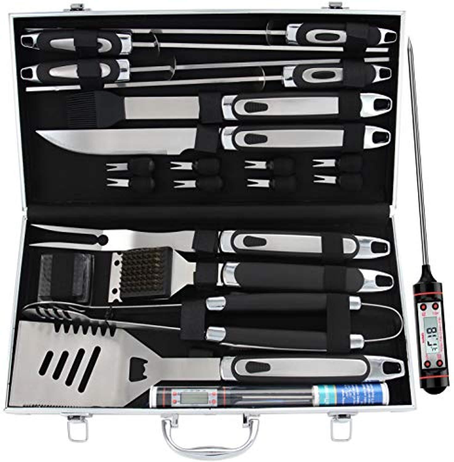 ROMANTICIST 21pc BBQ Grill Accessories Set with Thermometer - Heavy Duty Stainless Steel Barbecue Grilling Utensils with Non-Slip Handle in Aluminum Storage Case for Men Women