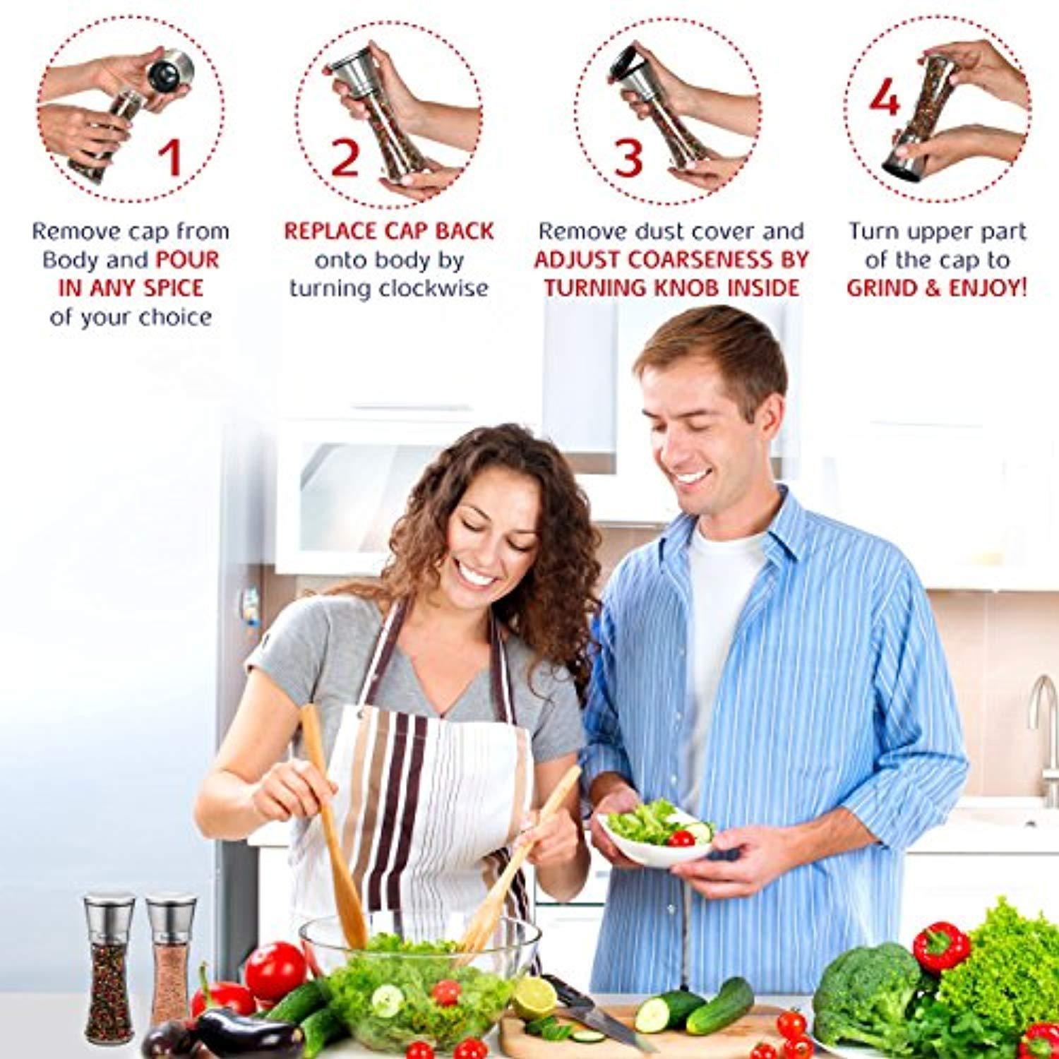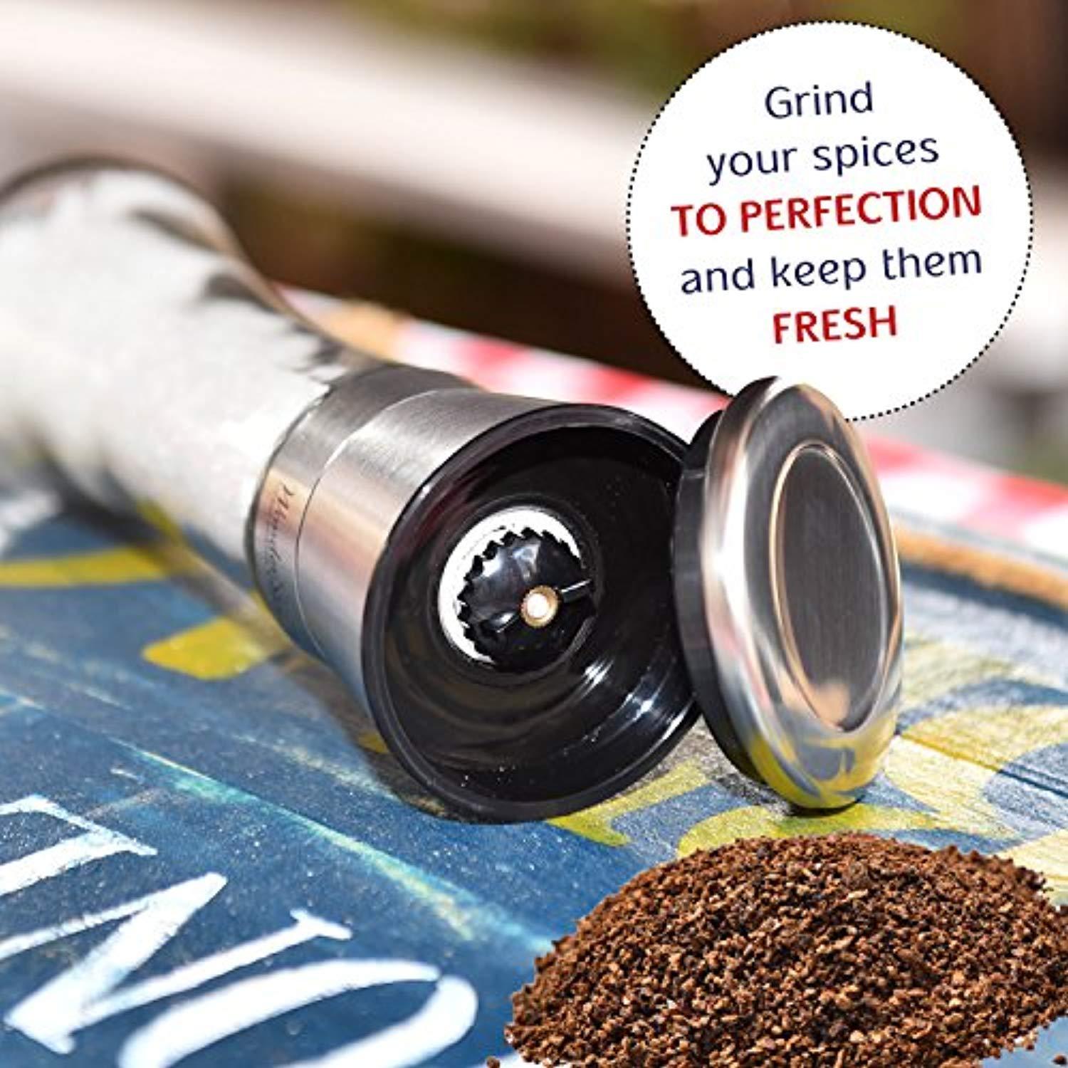 Salt and Pepper Grinder Set of 2 - Tall Salt and Pepper Shakers with Adjustable Coarseness by Ceramic Rotor - Stainless Steel Pepper Mill Shaker and Salt Grinders Mills Set with FREE Cleaning Brush