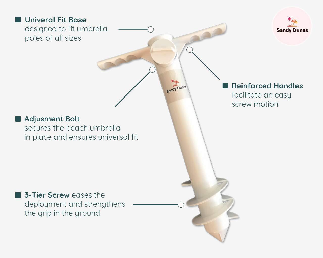 ⭐️ DURABLE MATERIAL - Constructed of solid ABS, the sand grabber withstands strong winds and helps keep you protected from UV rays in any condition. ⭐️ ONE SIZE FITS ALL - The sand anchor’s base is designed to match beach umbrella poles of all sorts. The pole adjustment screw helps you match the size of your beach umbrella to easily secure it in place. ⭐️ QUICK & EASY SETUP - its screw-like design and wide handles, enable you to easily mount the anchor in the ground, insert your umbrella, tighten the adjustment bolt and enjoy the beach within seconds. ⭐️ HIGH QUALITY & MAXIMUM SAFETY - This sand anchor will last a very long time due to its ABS build and safety-driven design. It is stronger and safer than the sharp metal anchors which rust over time and can be dangerous. ⭐️ TOTAL CONVENIENCE - Portable, lightweight and compact, it can be easily placed in your beach bag or backpack, bringing the shade with you no matter where you go.