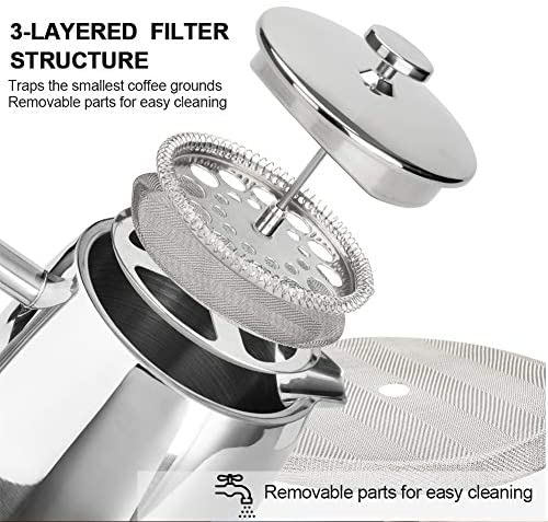 1. 5 Liter stainless steel French Press coffee maker. Both the exterior and the interior are made from top quality 18/10 stainless steel. This coffee maker is made to outlast other coffee makers! 3-LAYERED STAINLESS STEEL FILTER STRUCTURE traps the smallest coffee grounds to produce an exceptional full-bodied flavor BONUS Stainless Steel Screen included with this French press coffee maker. The filter screen is easy to disassemble and clean. Stack one or more screens together to give your espresso a more refined taste This French press coffee maker comes with our "Cool" touch handle and knob for comfortable and safe pouring The capacity of the Secura Stainless-steel French press coffee maker is 50 OUNCE/ 1500ML. All of the parts for this French coffee maker are DISHWASHER SAFE.
