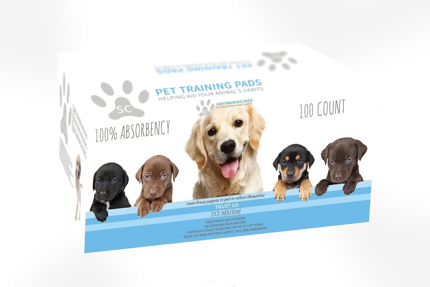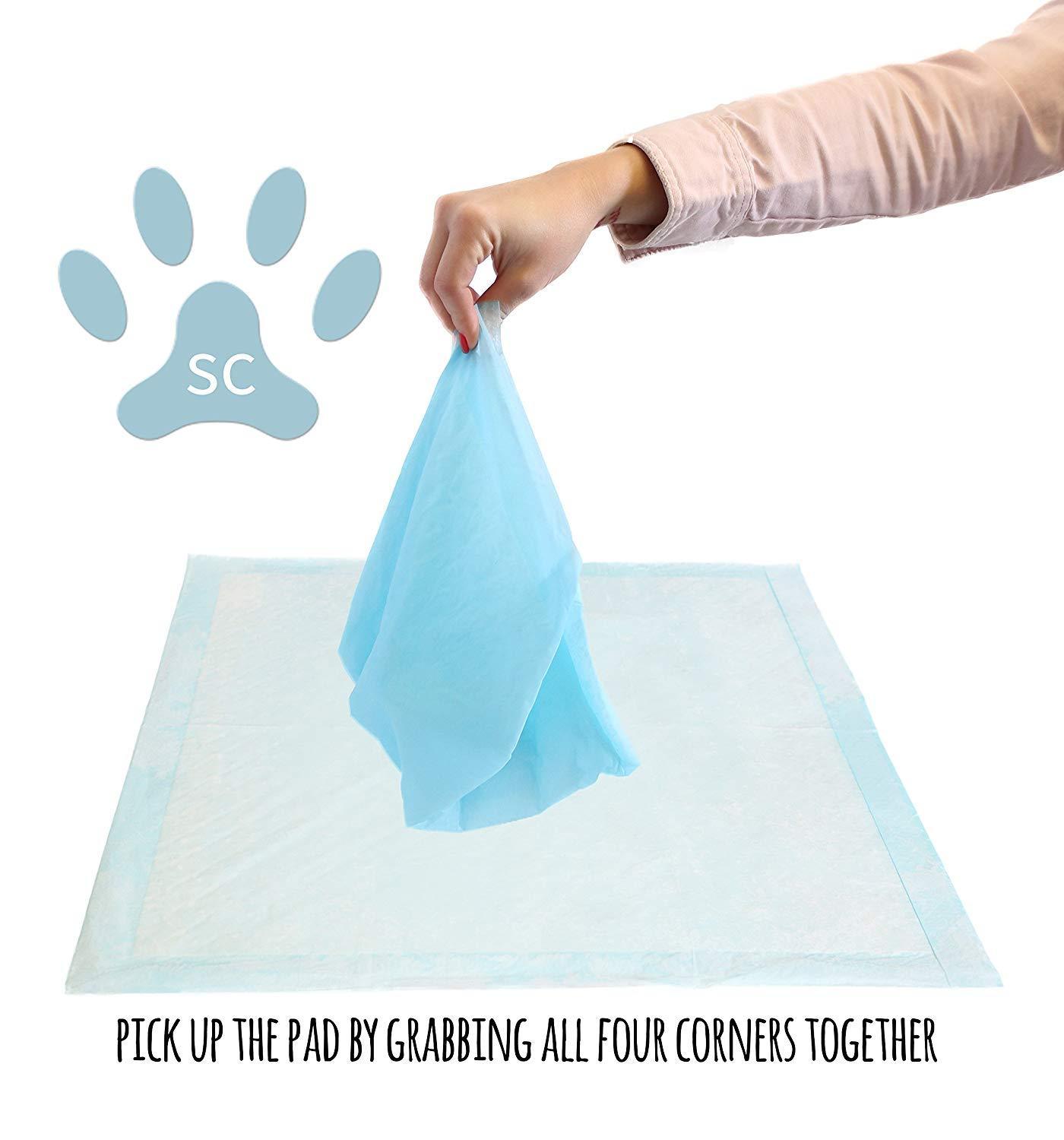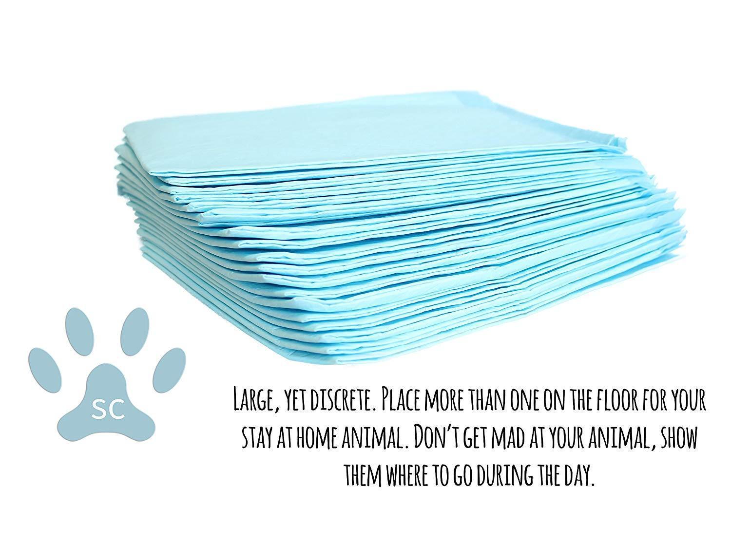• Get the best for your puppy with our puppy pads that give you the highest level of confidence for you and puppy. We have traveled the world to get you the best pee pads and puppy training pads. We added our unique moisture lock in our pet supplies wee wee pads for you and your puppy; • We give you pee pee pads that are 40 times more absorbent than newspaper and are also the greatest for floor protection. Puppy training pads are also great for lining crates or carriers or using in that spot set for training. We give you only the best pet supplies for dogs and our training pads are guaranteed to get your puppy on schedule and keep them there; • Our pee pads 100 count training pads are also great for dealing with muddy or wet paws, large spills, travel and protection around and under litter boxes. Not all pee pads for dogs and weeweepads for dogs feature a leak-proof polyethylene bottom sheet, sealed edges and a thick pulp like ours do; • Also used as pee pads for cats along with wee pads pads for dogs that have a powerful attractant that draws your pet directly to the pad. The Polymer gel technology traps liquid and draws moisture away from pets and the floor; • We guarantee that your pet will be trained in no time to the our puppies training pads. We have a 100% Total Satisfaction Guarantee so that if you are not absolutely happy with our dog puppy pads all you have to do is return the unused portion and we will promptly refund 100% of the purchase price. No Questions Asked.