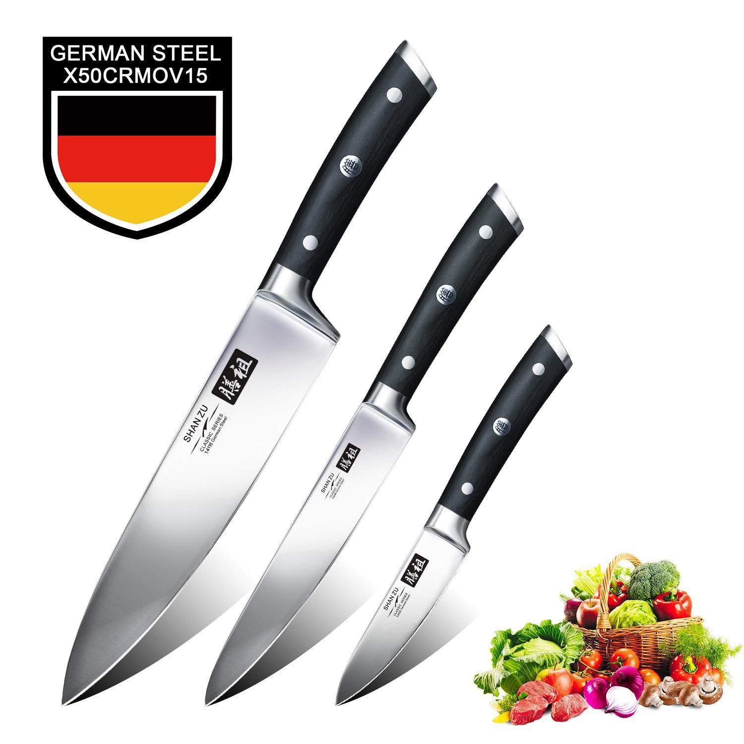 SHAN ZU Chef Knife Paring Fruit Knife Utility Knives Set 3 piece Cutlery Kitchen Cooking Chef Knives Professional Ultra Sharp German Stainless Steel Blade for Home Restaurant Travel
