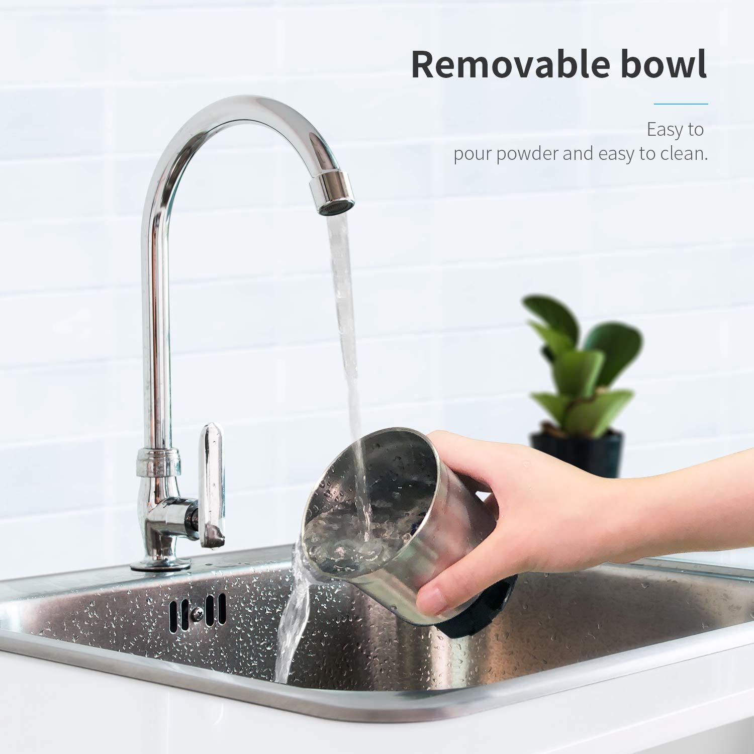 Just by simply pressing the lid with different time to custom grind settings. Get desired powder in 20 seconds or less. No flavor contamination. One grinder bowl with 2 blades for dry grinding like coffee bean and grains; one chopper bowl with 4 blades for wet grinding like garlic and basil. Bowls are removable and easy to transfer powder and to clean. High-quality stainless steel blade and 200W powerful motor ensure continuous and even grinding for better maintaining the original flavor. Steady and Safety lock and nice sealing ring effectively prevent powder splashing. ETL approved. 120V. 2 in 1 spoon with brush. 6-month hassle-free replacement.