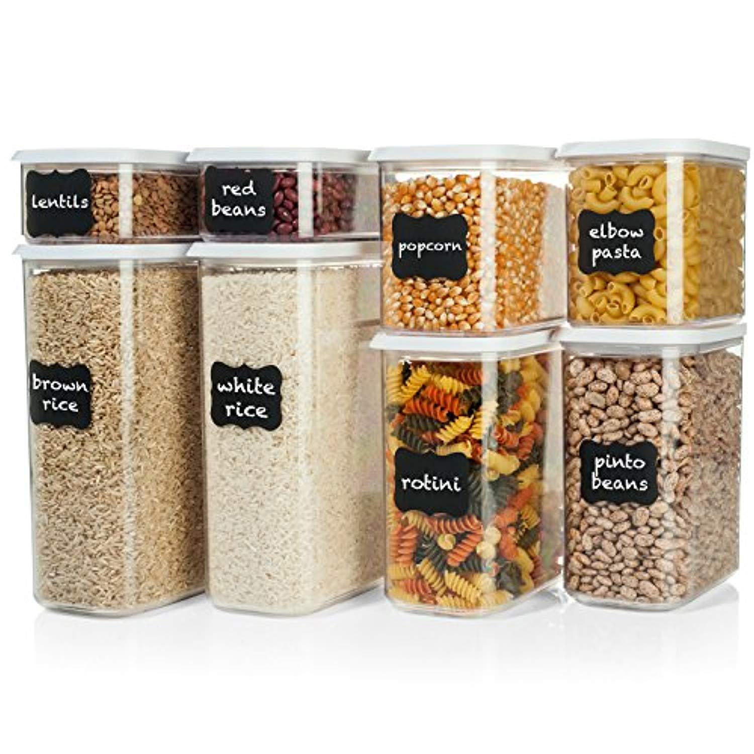 COMPLETE RANGE OF SIZES - Every air-tight container has been designed to seal in freshness while making access and food prep a breeze. Full range of sizes ! store your favorite food safely into these efficient containers. With 8 different sizes for edibles of all shapes, sizes, and volumes, you won't have to worry about jamming your edibles into containers. Includes 2 Tall Container (8.4 cups /2.0 liters), 2 Medium Container (6.3 cups / 1.5 liters), 2 Small Containers (4.2 cups / 1.0 liter), 2 DRY FOOD LIQUID & FRIENDLY - Not only are these good for dry foods, but our containers are great for holding liquids such as water, juice, soup, and more. Container corners allow for easy pouring. Don't worry about spills as the Shazo containers are designed to seal all liquids with airtight technology SECURE SEALING - Lids from a tight seal for extended freshness and fit securely to keep food fresh. Perfect for pasta, grain, snacks, coffee, tea, nuts, baking ingredients and more. Also only good for dry foods, also great for holding liquids such as juice, soup , water and more. Do not worry about spills as the containers have been pushed down STACKABLE LID DESIGN - With a stackable and modular design, these containers will save you a ton of space in your pantry and cabinets for better kitchen organization. FDA approved and shatterproof 18 LARGE CHALKBOARD LABELS & LIQUID CHALK MARKER - Matte texture with a crisp clean uniform dye cut shape; The surface is not shiny or slippery; STRONG and DURABLE for an appealing look; These are VINYL stickers - Unlike contact paper, these Premium Chalkboard Labels allows regular chalk or Included liquid chalk maker to write on. The ink dries quickly and it doesn't flake off; refrigerator safe. NOT Dishwasher safe.