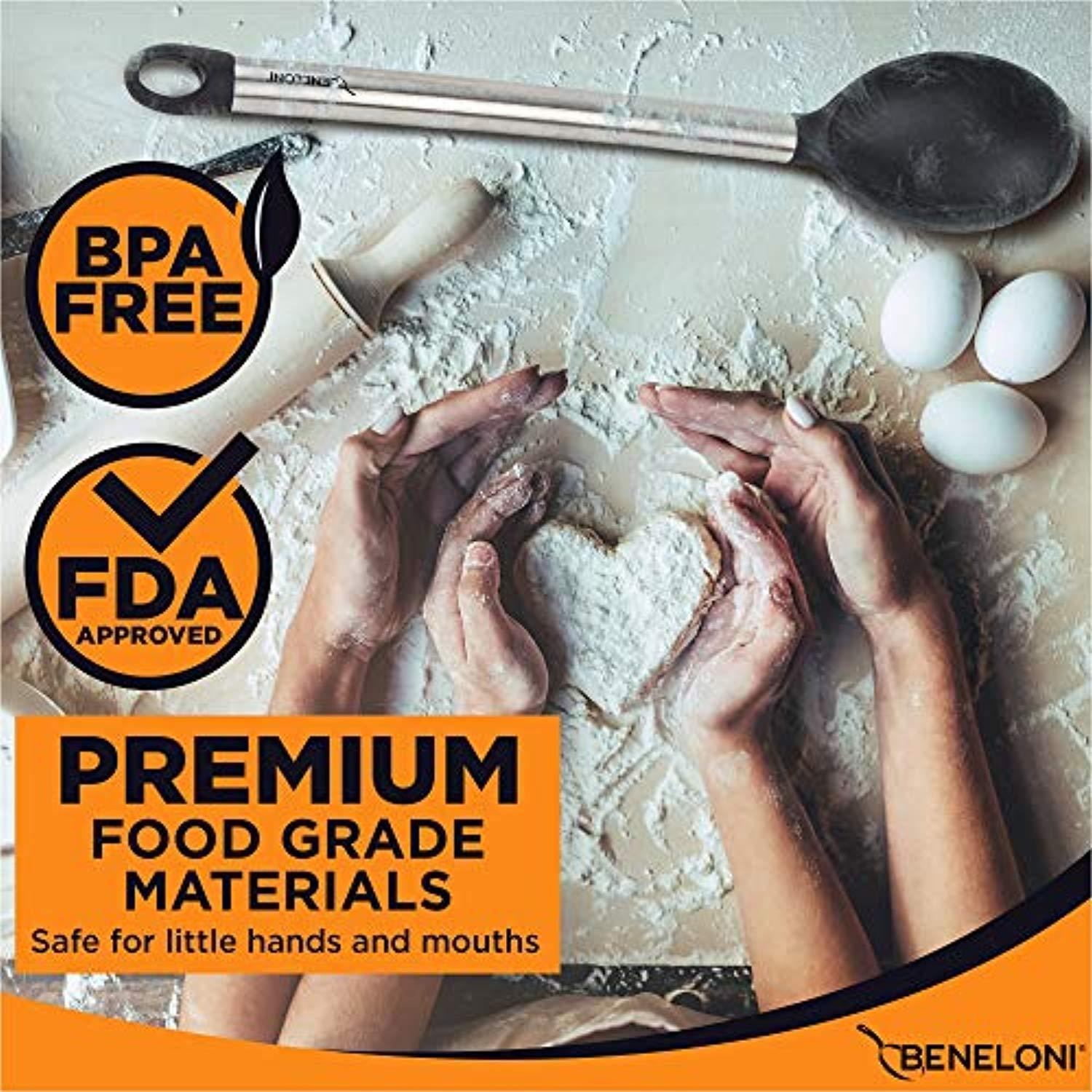 ✅Silicone Serving Utensil Set; Our safe nonstick utensils are created with high quality food grade silicone to protect your health your pans and your utensils meaning no more leaching no more scratching and no more melting ✅High Quality Durable and Thick Stainless Steel; metal and black silicone construction give you beautifully stunning tools that feel good in your hand and attach securely to magnetic strips ✅Complete set of 8 Utensils; fully equip your kitchen in one easy purchase; This modern set includes Tongs Spoon Spatula Ladle Whisk Pasta Server Strainer and Frosting Spatula; comes in a beautiful gift box ✅Superior Function and Quality; all our utensils come with durable seals for water tightness; sturdier silicone for easy flipping stirring and scooping; and thicker steel for long lasting durable handles Even our whisk is made with thicker gauge steel so you never have to worry about bending or breaking ✅Satisfaction Guarantee; our professional modern cooking tools are backed by our manufacturer 30 day money back guarantee with 1 year free replacement warranty