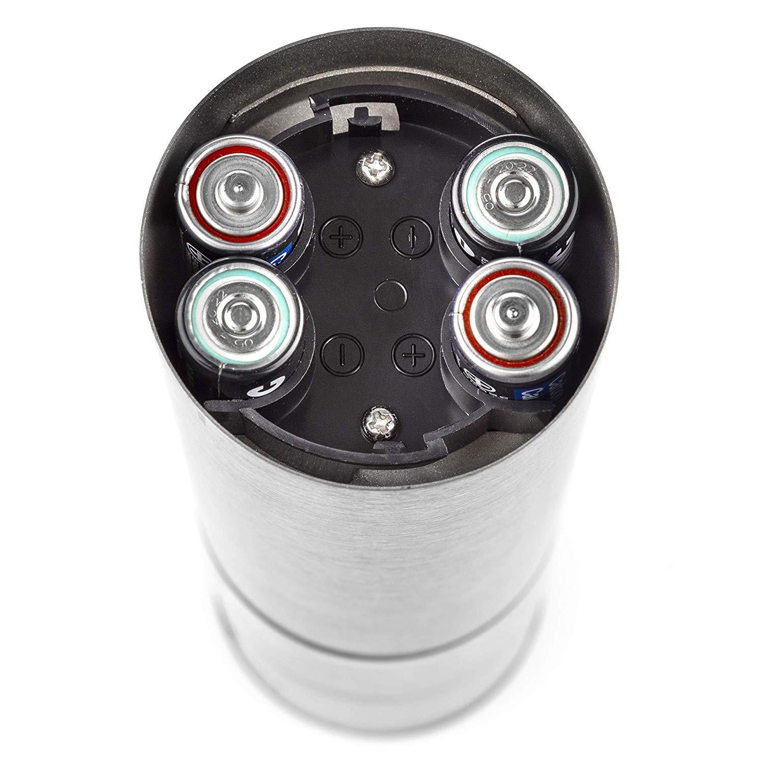 SIMPLE LOFT Electric Salt and Pepper Grinder Set; Our automatic (battery powered) stainless steel salt and pepper mill set is built to last with the highest quality materials and comes with a built in grinding light, elegant metal stand, protective rubber caps and a free cleaning brush. Modern One-Hand Operation; Easily control the grinder while multitasking in the kitchen by pushing the stainless steel button which means less wasted ingredients (compared to gravity mills) while grinding the perfect amount for your recipe.