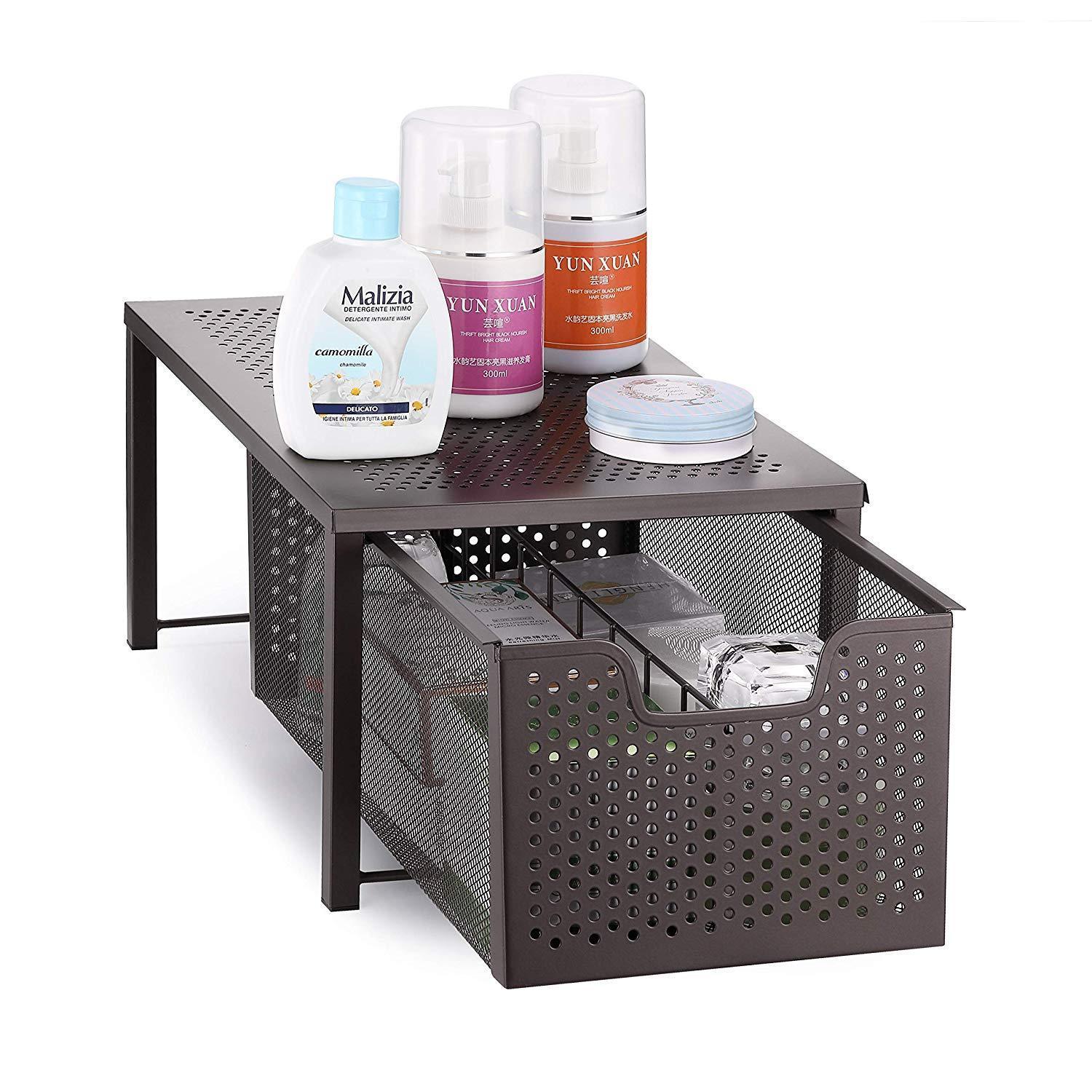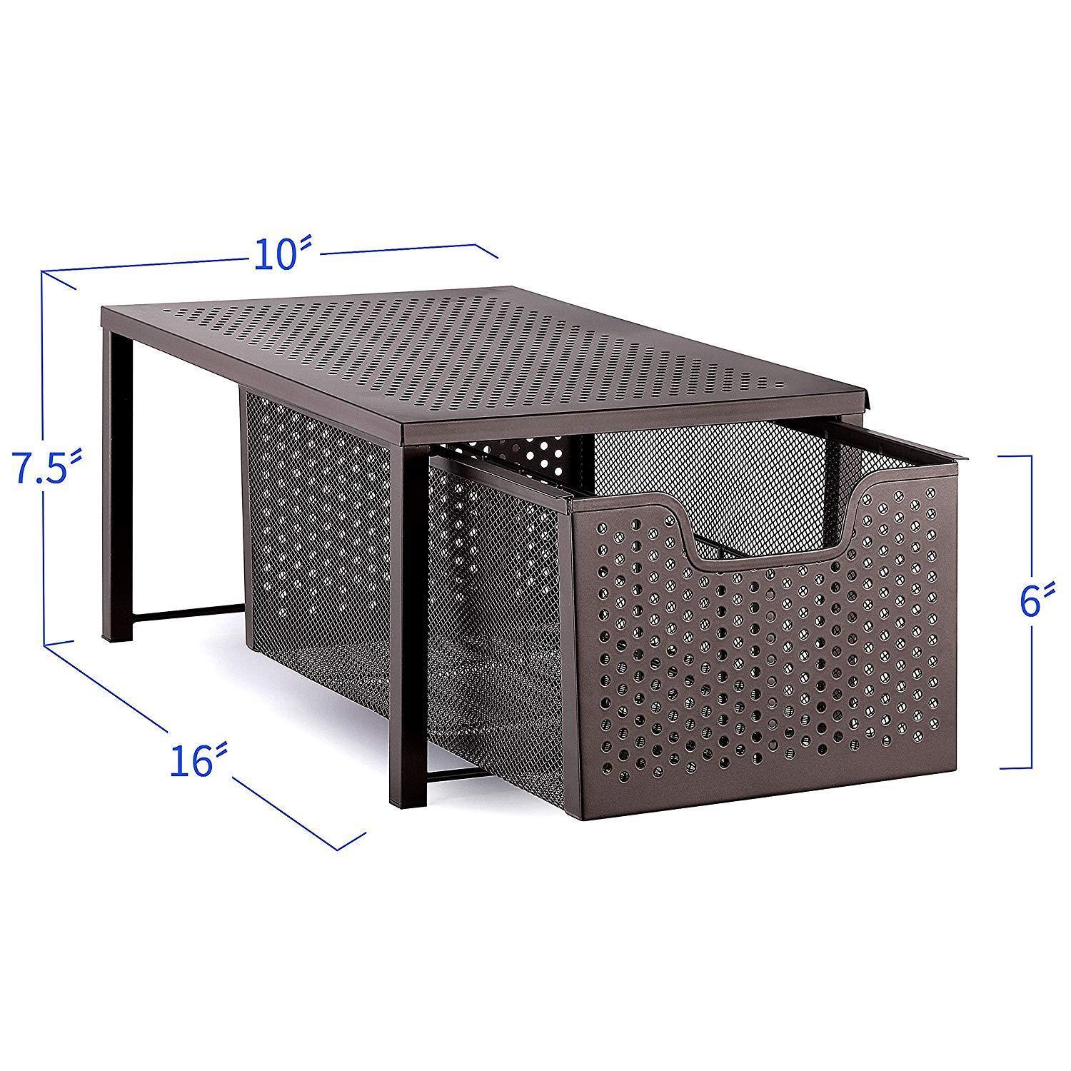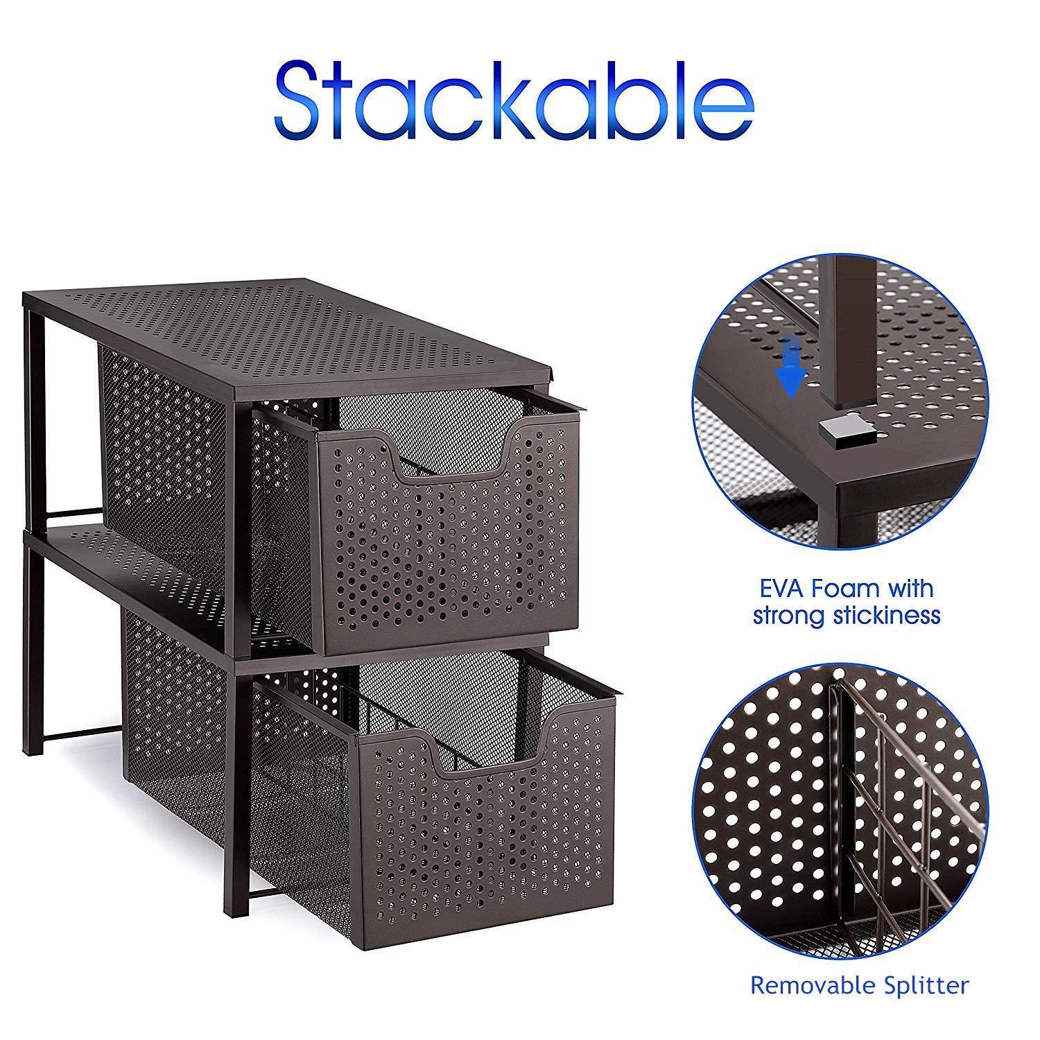 【Space-Saving Organizer】Sliding storage basket is ideal for organize increase extra storage space in your kitchen Bathroom office 【Stackable Design】Include EVA foam stickers and stacked firmly without scratching the top surface. Stack up to multiple units that maximizes storage space in the same footprint 【Removable Splitter】Helps you to group items; Keep supplies and essentials neatly stored to easily visualize and access storage 【Stability Construction】Easy to assemble; Made of sturdy durable metal construction with bronze plating; PET anti-slip pads to prevent it from sliding or scratching surfaces 【Dimension】10"W x 16"D x 7.5"H; USPTO Patent Pending