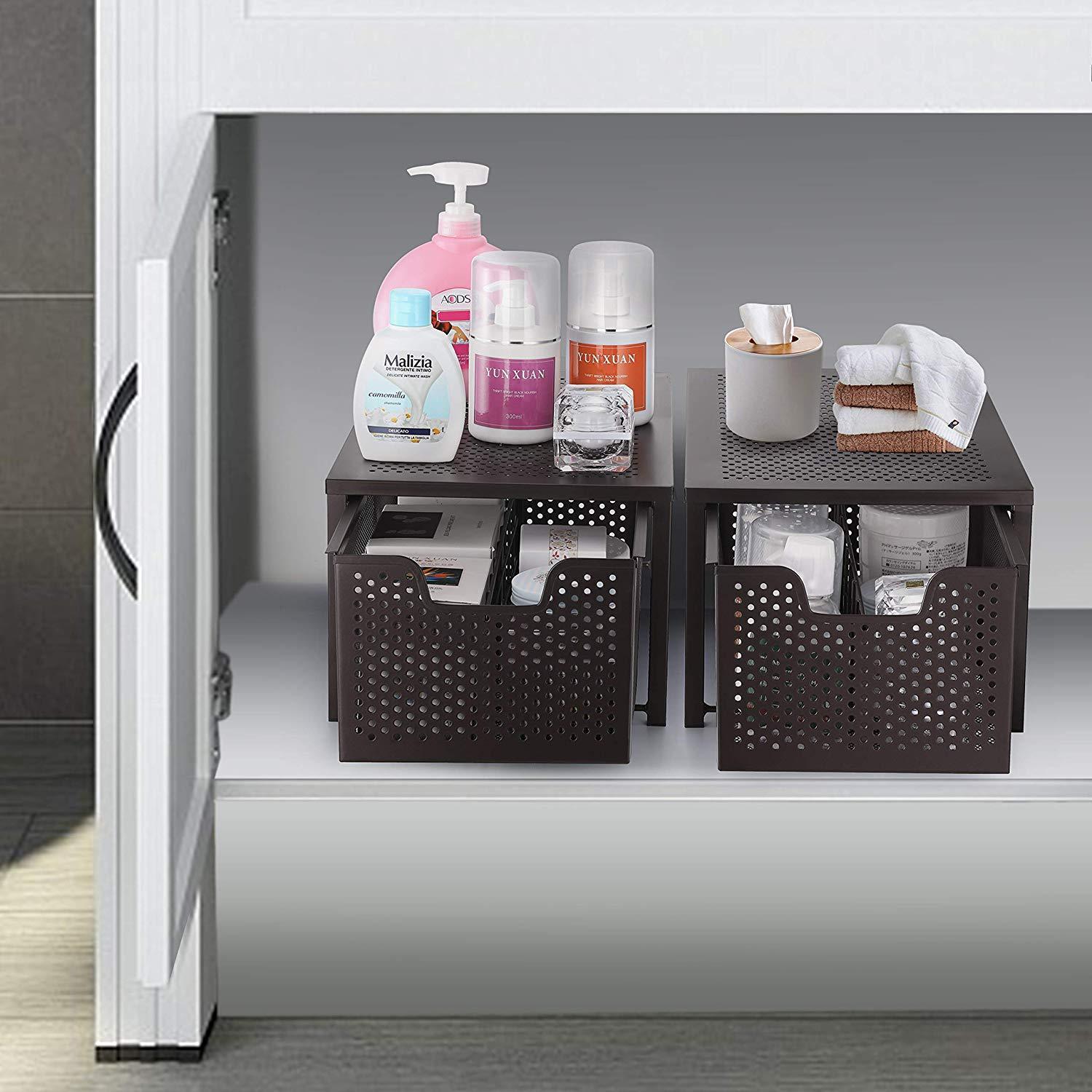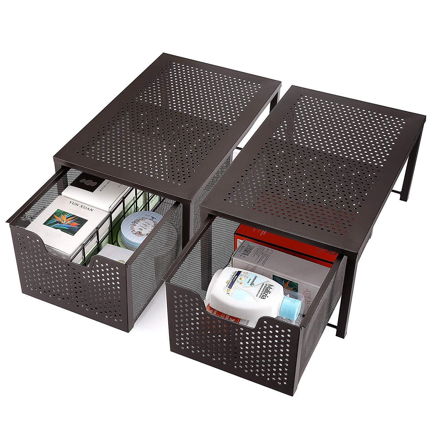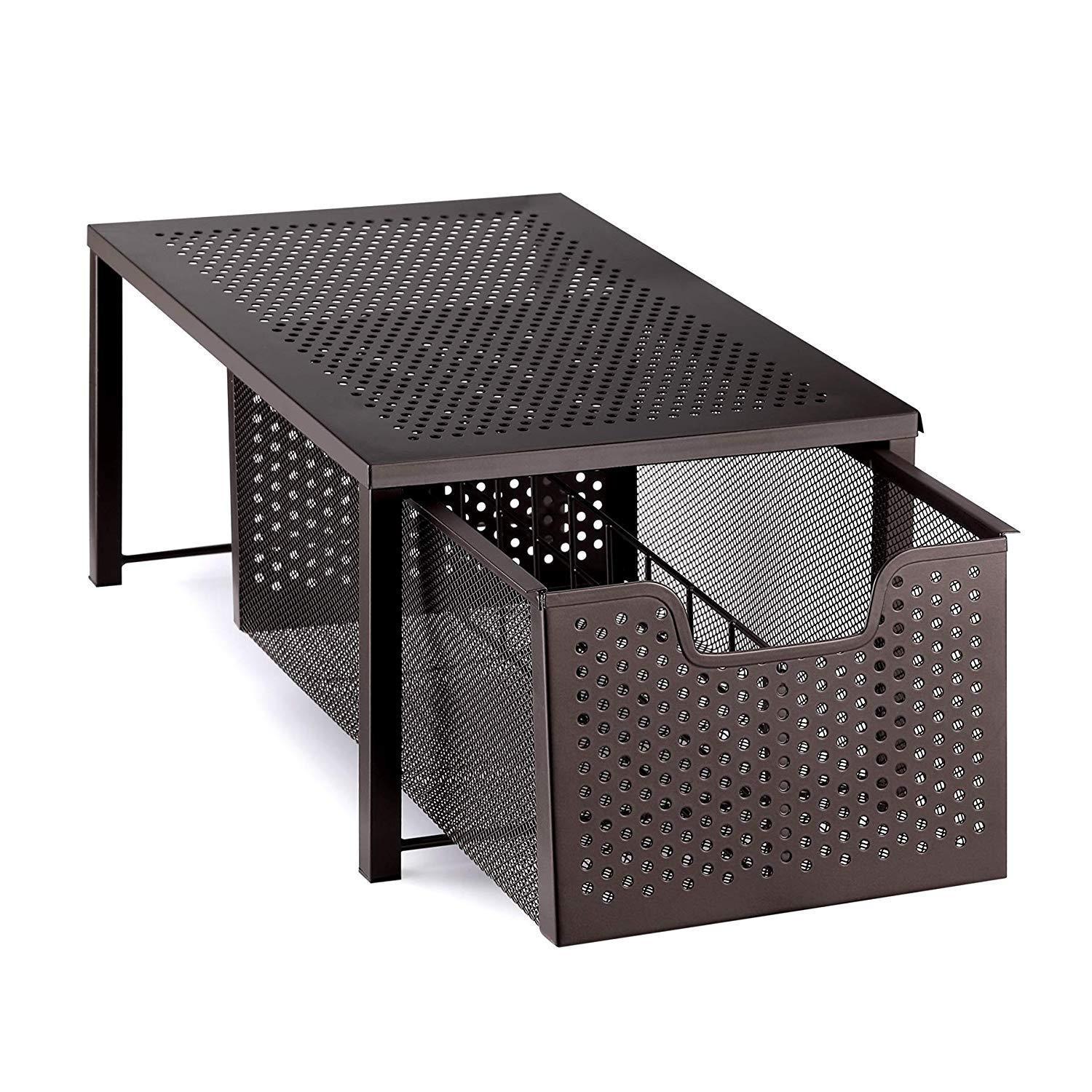 【Space-Saving Organizer】Sliding storage basket is ideal for organize increase extra storage space in your kitchen Bathroom office 【Stackable Design】Include EVA foam stickers and stacked firmly without scratching the top surface. Stack up to multiple units that maximizes storage space in the same footprint 【Removable Splitter】Helps you to group items; Keep supplies and essentials neatly stored to easily visualize and access storage 【Stability Construction】Easy to assemble; Made of sturdy durable metal construction with bronze plating; PET anti-slip pads to prevent it from sliding or scratching surfaces 【Dimension】10"W x 16"D x 7.5"H; USPTO Patent Pending