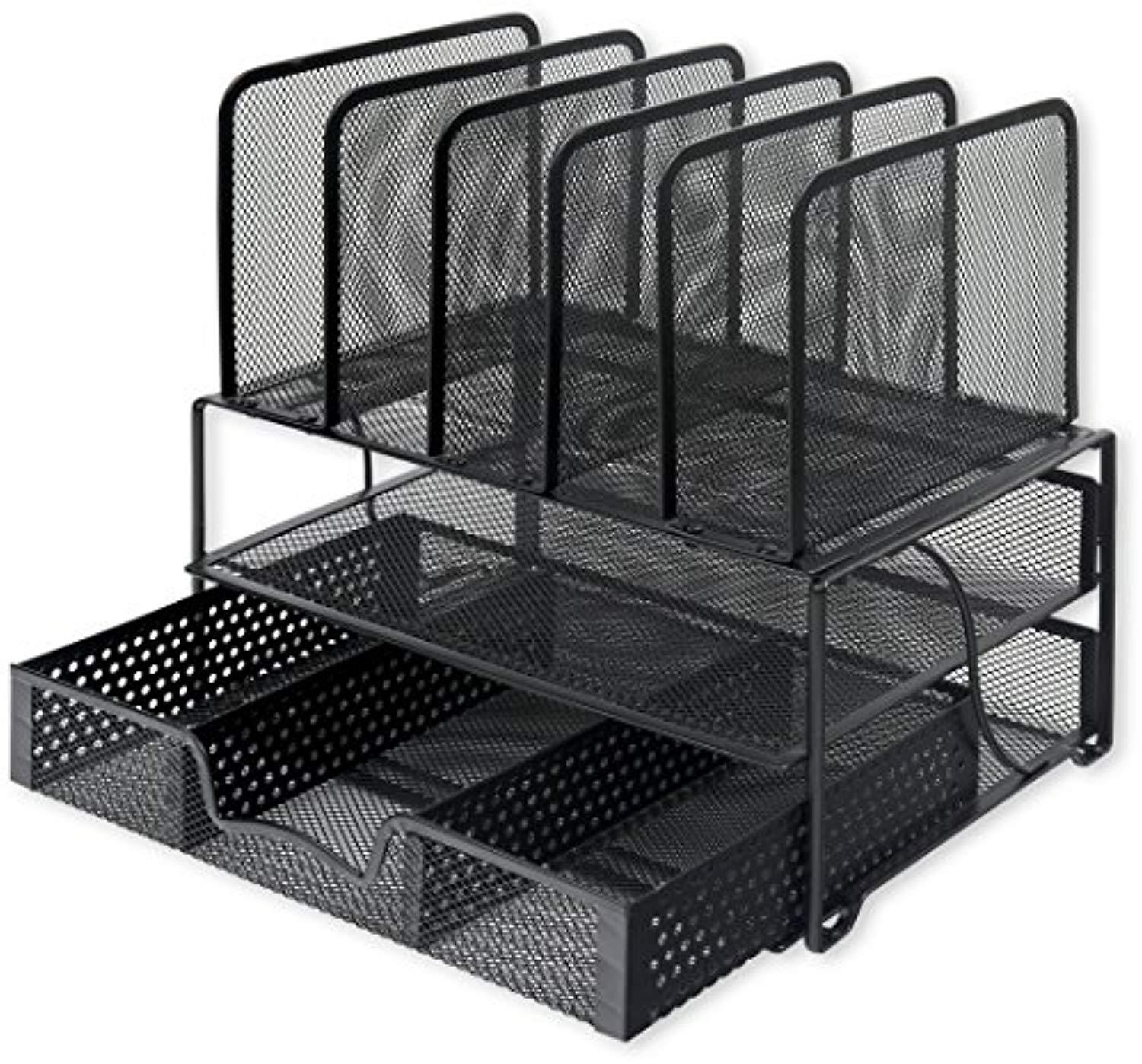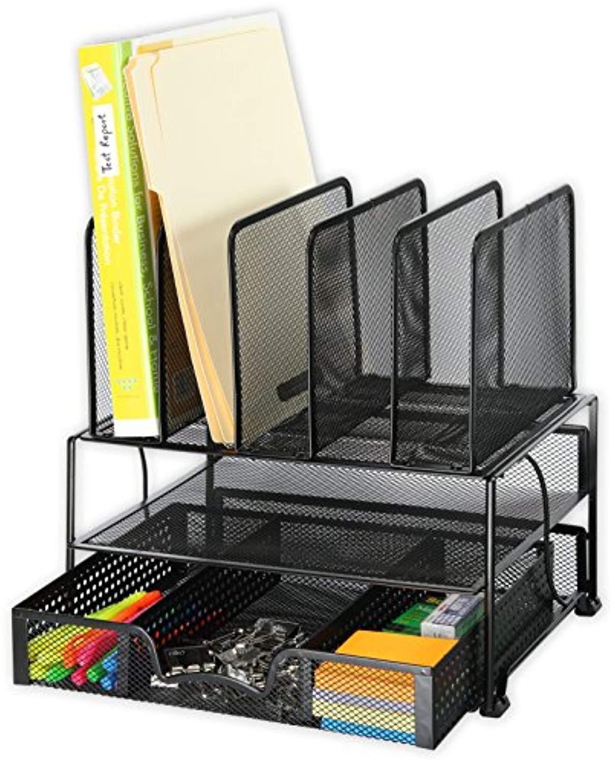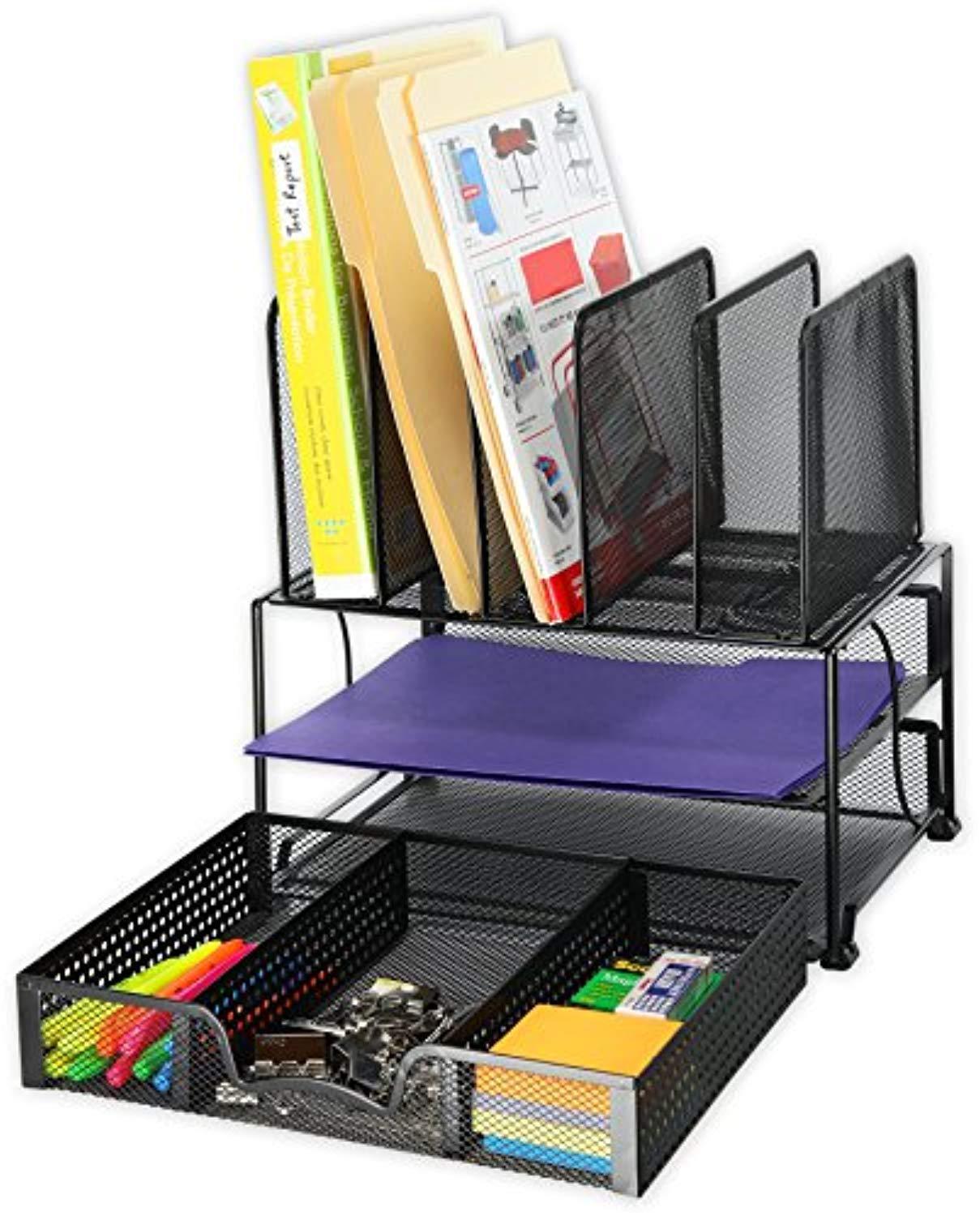 SimpleHouseware Mesh Desk Organizer with Sliding Drawer, Double Tray and 5 Upright Sections, Black