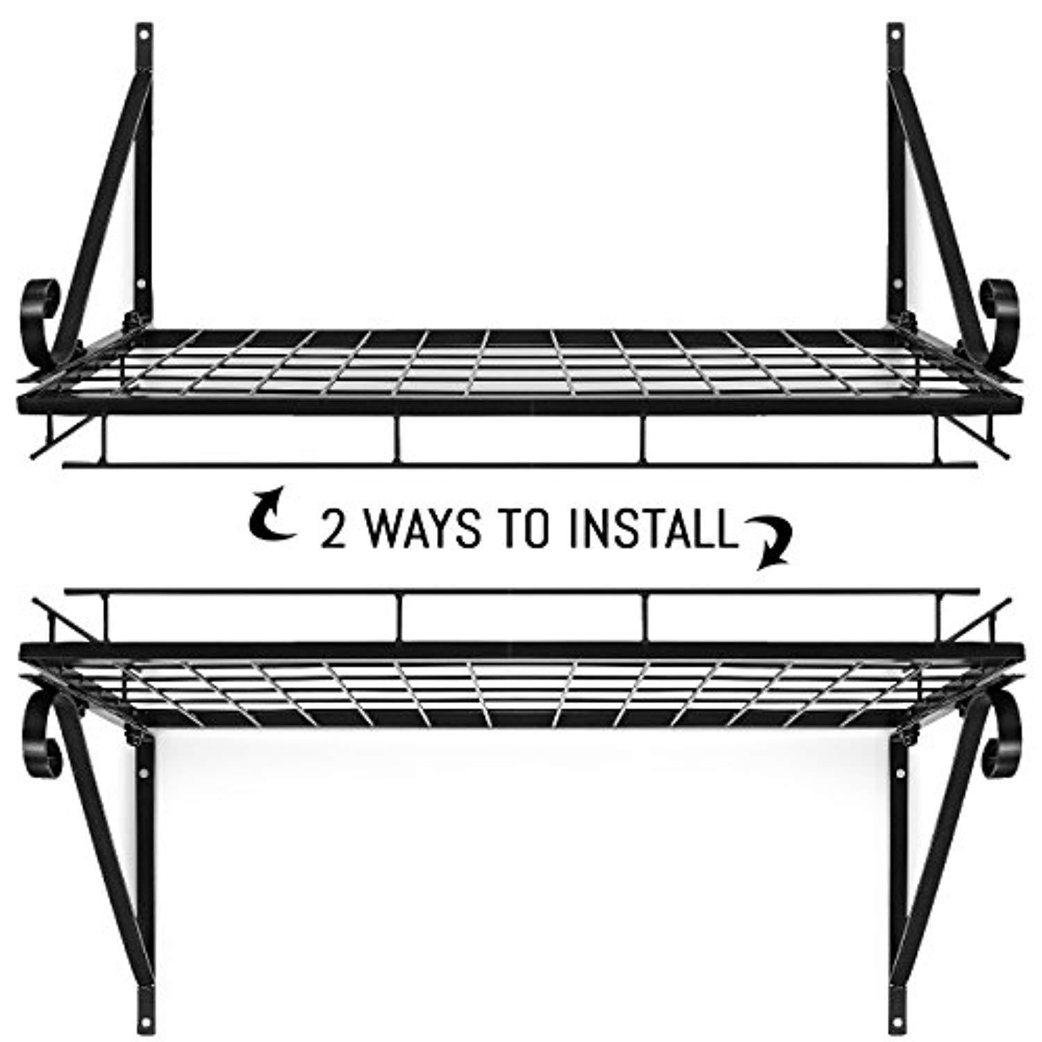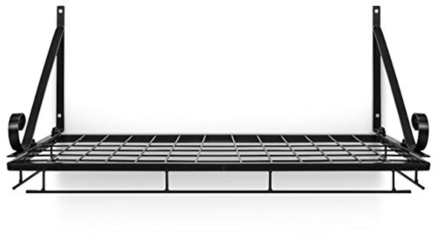 WALL MOUNT POT RACK (BLACK) — Mounts on wall to store, organize, and display your cookware collection in one compact space DISPLAY & ORGANIZE — Specially designed to hold pots, pans, utensils, cookbooks, bakeware, plants, and other decorative pieces — A great way to showcase a stylish kitchen — Upper shelf keeps kitchen pots and pans within easy reach on flat surface and hooks keep utensils and other cookware hanging vertical for customized organization — Hooks can be repositioned to fit needs — Great for everyday meal prep, hosting dinner parties, events, holiday gatherings, and more EFFICIENT SPACE SAVER — Eliminates clutter, frees cabinet space, and protect against scratches — Saves time and hassle of searching through cabinets and countertops — Built-in shelf provides added cupboard space and plenty of room to store essentials — Space-saving curved shape frame provides easy access for tight spaces and convenience for limited storage — Great for condominiums, tiny apartments, studios, small kitchens, or anywhere with limited storage space MULTI-PURPOSE SHELF — Ideal for any room in the house — Install in kitchen, pantry, dining area for everyday cookware or bathroom to store drying towels and toiletries — Also suitable for study, office, or walk-in closet — Sturdy center grid does double duty and functions as shelf for books, baskets, toiletries, plants, and many other household items EASY TO ASSEMBLE — Minimal assembly required with quick set-up — Support brackets can be installed to support the rack from above or below — Made of steel with powder-coated finish — Decorative frame for stylish look — Complements most light fixtures, appliances, cookware, and design interiors — Package includes grid rack with 2 support brackets, 10 hanging hooks, and mounting hardware — Measures approximately 24.50" L X 10" W X 10.50" H