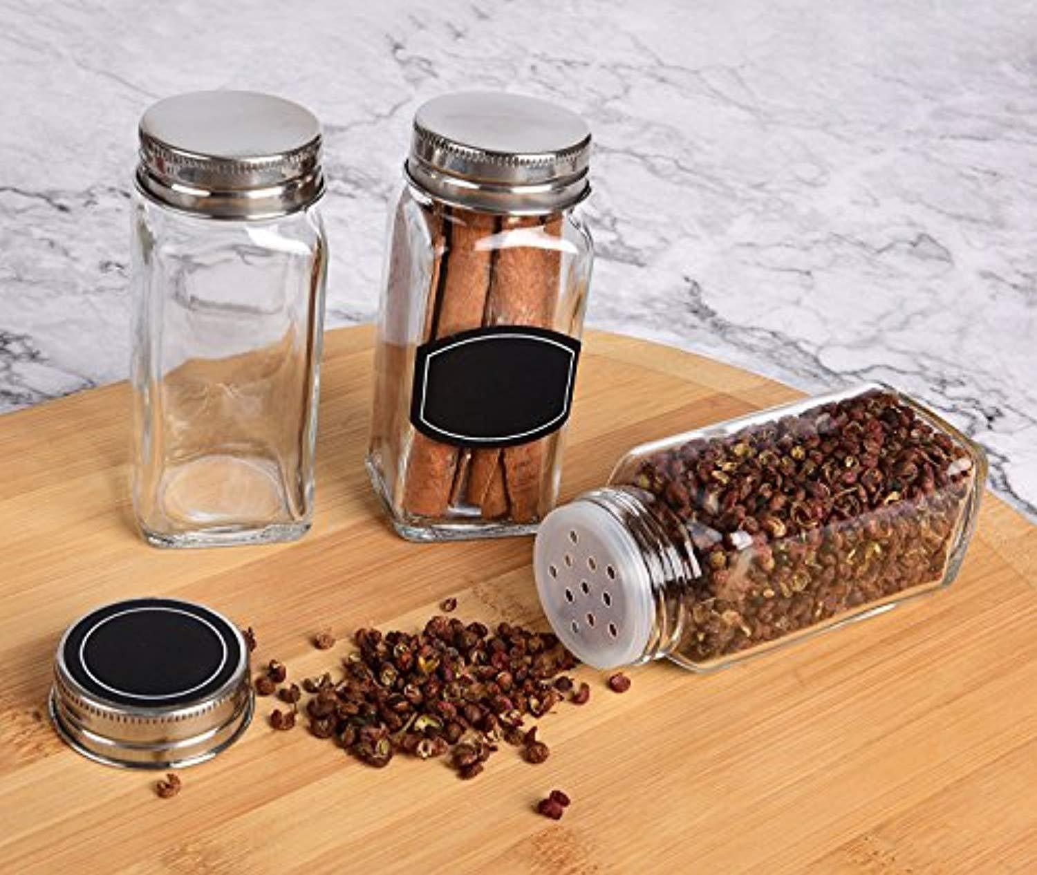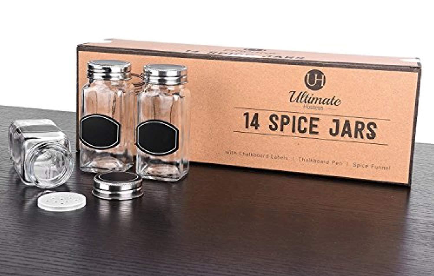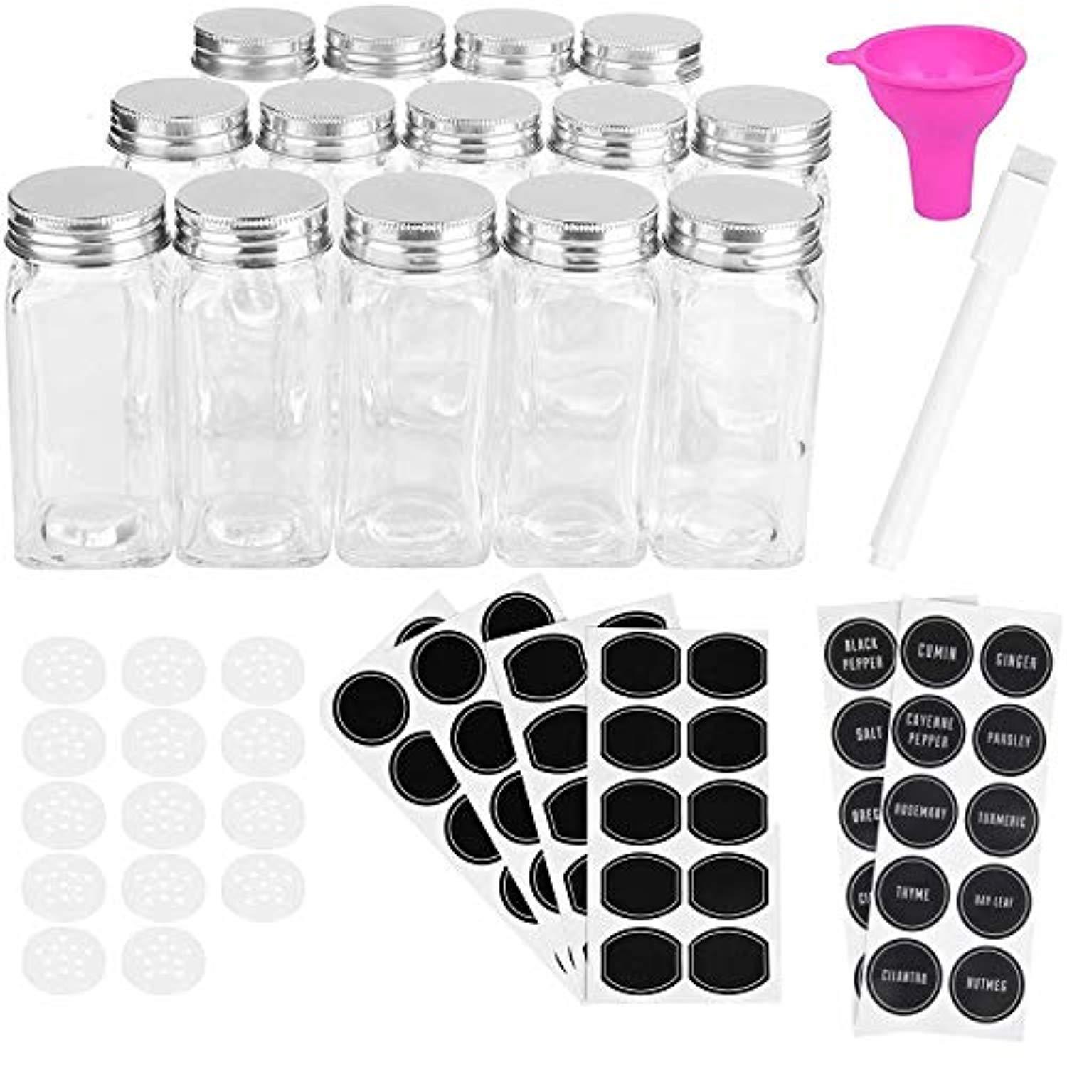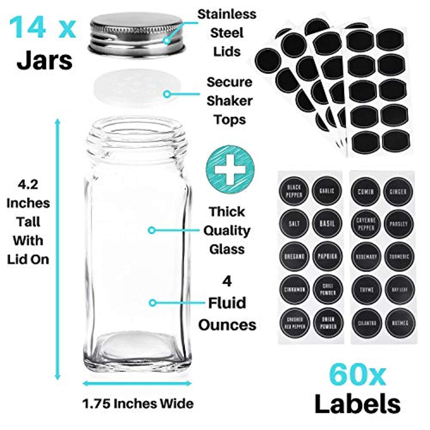 Spice Jars Bottles - 14 Square Glass Containers (4 oz) with 60 Chalkboard Labels, Chalk Marker, Stainless Steel Lid, Shaker Insert Tops and Wide Funnel - Complete Organizer Set