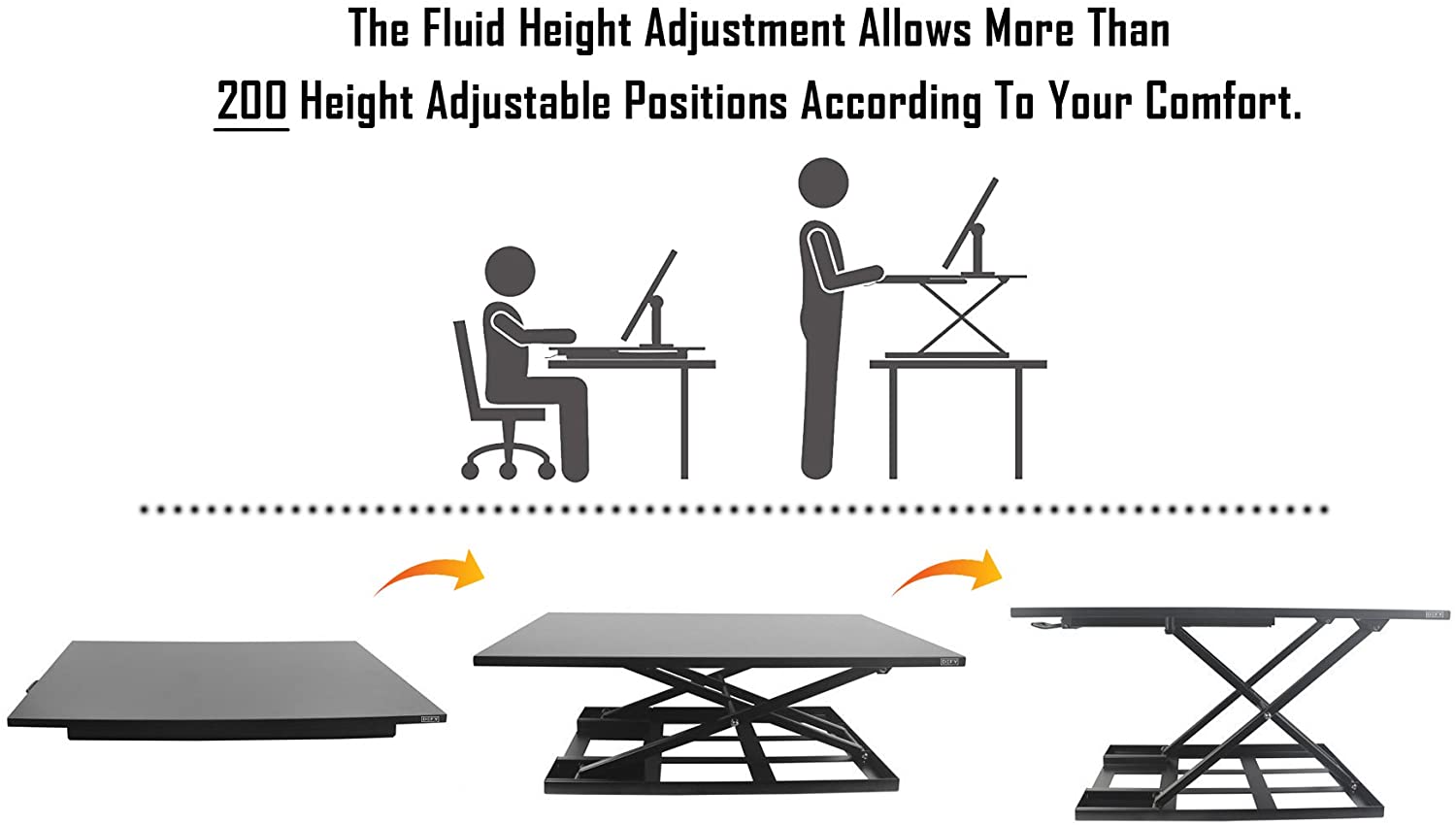 ✅EASY TO SIT/STAND – Our sit and stand desk has a durable steel base and a pneumatic air cylinder for smooth raising and lowering. The height adjustable desk is extremely easy to operate even with heavy loads such as dual monitors. It allows for ease of use when raising/lowering multiple times a day. Our desks are tested for over 10,000 rise & drop sessions to last a long time. ✅SITTING IS THE NEW SMOKING - Concerned about your health and wellness? Science continues to show the health threats of prolonged sitting, tying a sedentary life to heart disease, diabetes, and more. Use our elite standing desk to prevent any of these misfortunes and increase health benefits. ✅ERGONOMIC HEIGHT RANGE– The fluid height adjustment allows more than 200 height adjustable positions according to your comfort. With a maximum height of 16.9” above your current desk, our adjustable desk riser is designed for people between the height ranges of 5' to 6'3. ✅FULLY ASSEMBLED – Use your new desk right out of the box in less than 5 minutes. Our adjustable desk riser does not require any assembly or desk restructuring. Simply place on top of your desk and start living healthier. At the surface size 32” x 22”, the desk converter supports up to 30 lb, and gives you plenty of space to work with, allowing two 21 inch monitors with ease. ✅100% MONEY-BACK GUARANTEE - Dapper Display products are backed by 100% guarantee that you are fully satisfied with your product or receive your money back. Please contact us if you experience any issues, because customer satisfaction is our #1 policy!