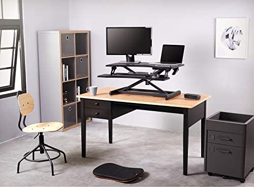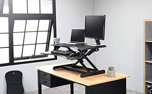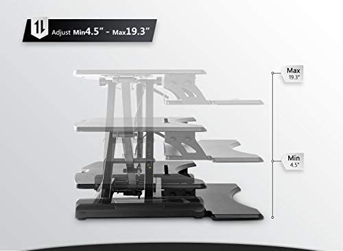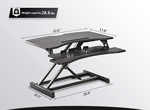 【QUICK TRANSITION】 Gas spring hovering system allows the tabletop workstation to adjust smoothly from sitting to standing by using a light squeeze of the handle. (Adjustable range: 4.5" – 19.3") 【SPACIOUS WORK AREA】The top surface measures 32.6" W x 17.8"D providing plenty of space for a single monitor and monitor setups. Suitable for small tabletop workstation use. 【STURDY STRUCTURE】Ergonomic design standing desk. The solid structure keeps your riser steady and the maximum weight holds up to 28.6 lbs. 【TRUSTWORTHY】- Standing Smoothly, sturdy design is backed with a 10-year whole standing desk warranty and friendly tech support to help with any questions or concerns.