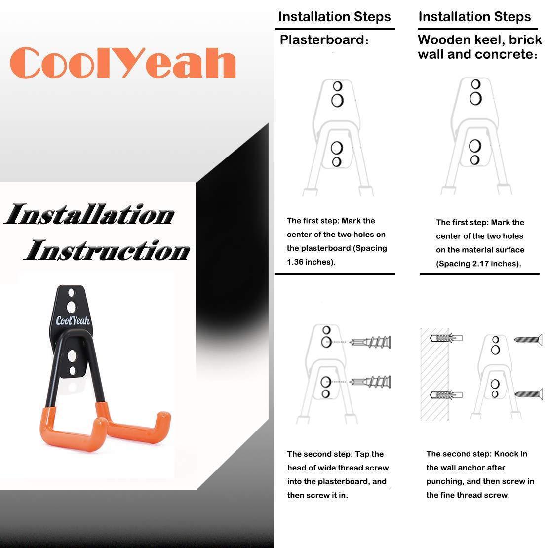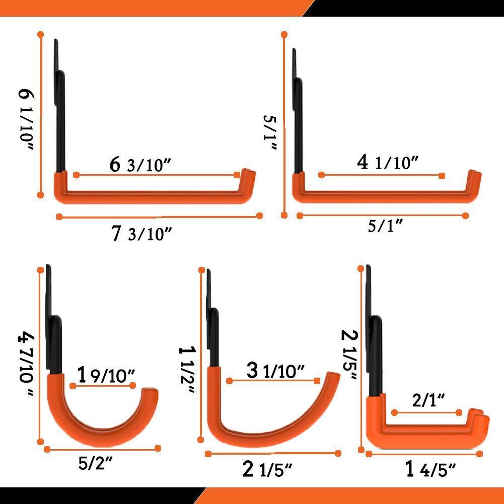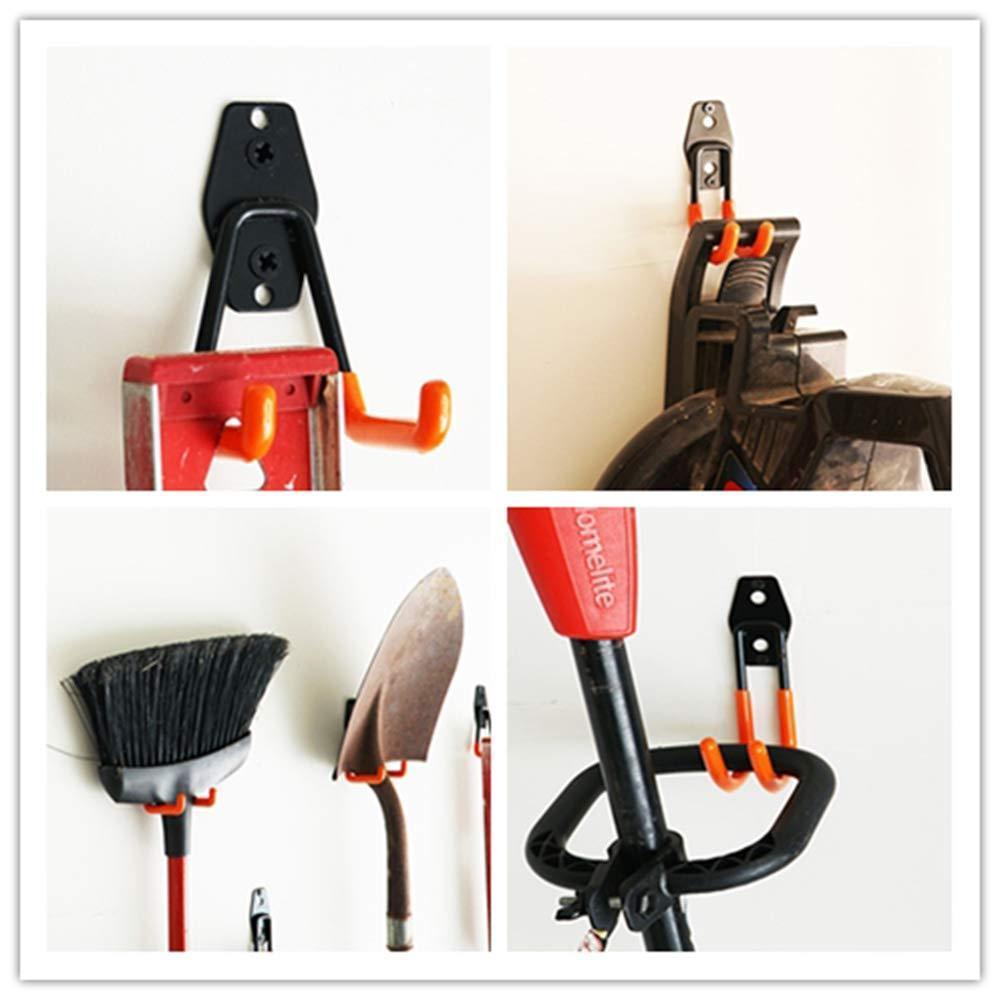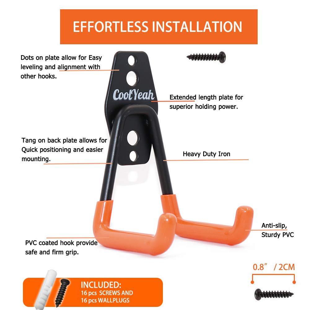PERFECT FOR HEAVY OBJECTS – hooks is a set of 8 wall mounted double hooks. The extended length and anti-slip coating let you organise and hang heavy objects for up to 40lbs. VARYING SIZES AND FUNCTIONS – garage shovel hooks have different sizes for various uses. It creates an efficient storage space, just what you need to hang and hold your items, such as folded,chairs,ladders,bicycles,power tools, and other multiple heavy bulky items. double hooks design qualified to hang air hose, garden and lawn tools, part of ourdoor equipments. Hanger off the ground in your garage garden or home! Endless options for efficient storagein the garage,shop,basement,or shed. EFFORTLESS INSTALLATION – The notches and spike at the back of the plate allow you to fasten or adjust the hook plates easier. They fit on drywall, wall stud and other wall types neatly and quickly. The distance between mounted holes is 1.6-2.3 inches. Comes with 32 set of screws and wall plugs inside the package! PREMIUM HEAVY DUTY MATERIAL – garage hooks are made of heavy duty iron, while the anti-slip coating is made of sturdy PVC. They’re durable to endure heavy weights and prevent slips for years of use!