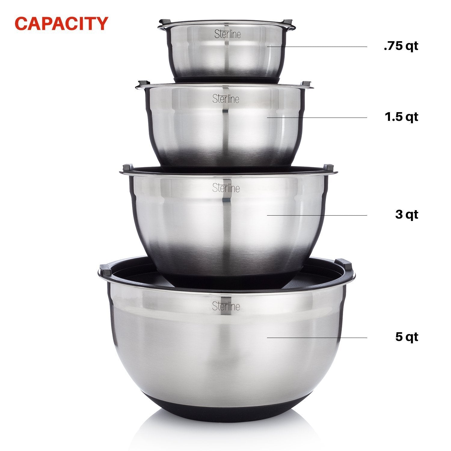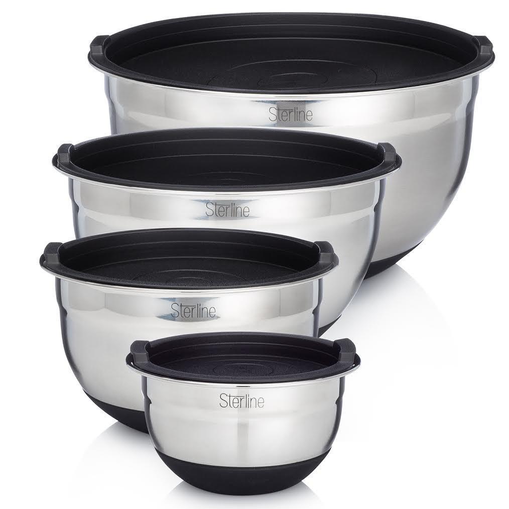 Sterline Stainless Steel Mixing Bowl Set of 4 w/Lids, Non-Slip Mixing Bowls .75, 1.5, 3, 5-Quarts w/Measurement Displayed Inside, Small-Large Nesting Bowls, Cooking and Kitchen Essentials, Silver