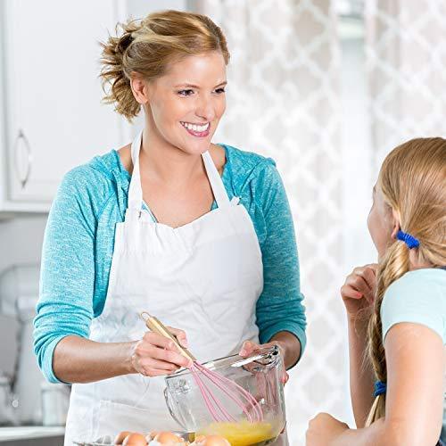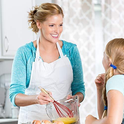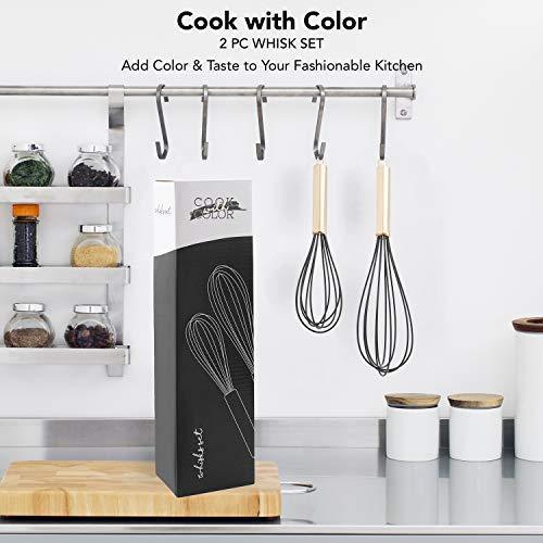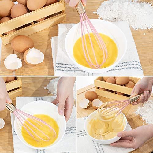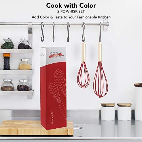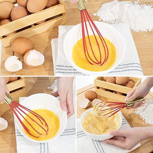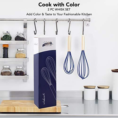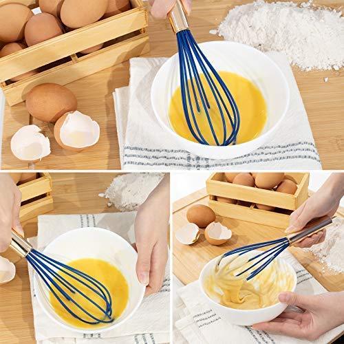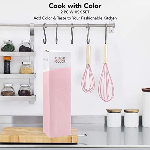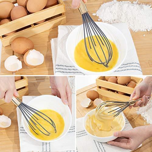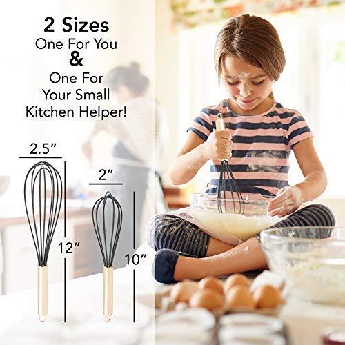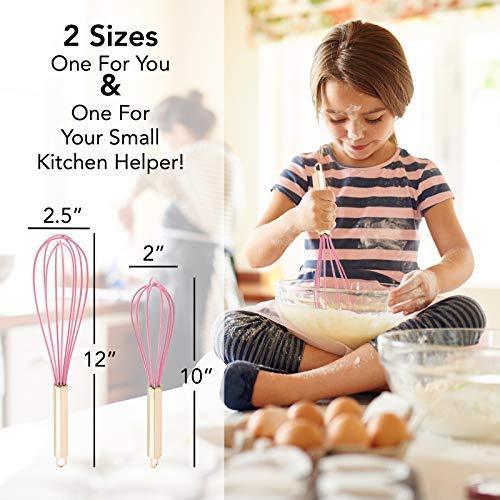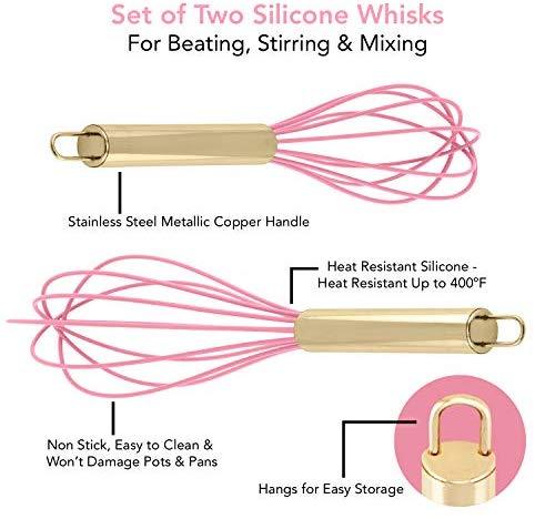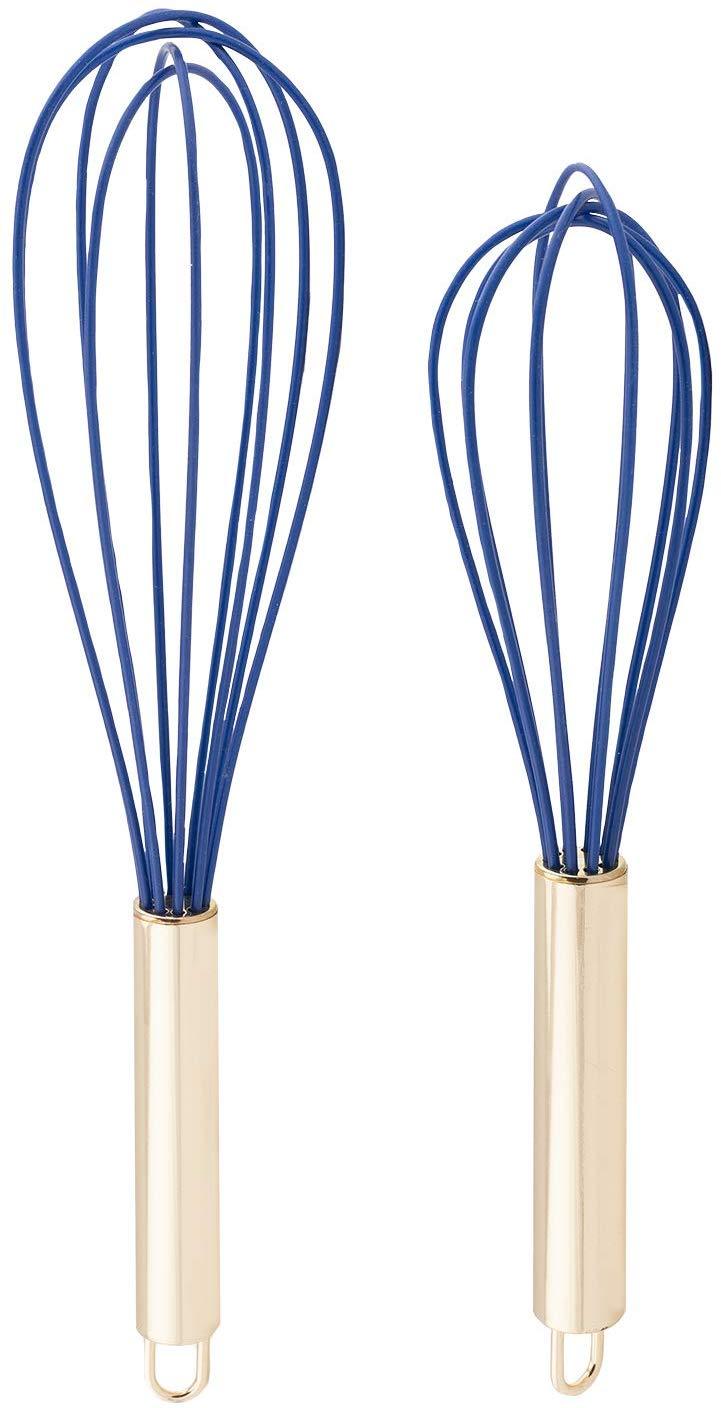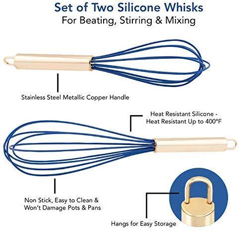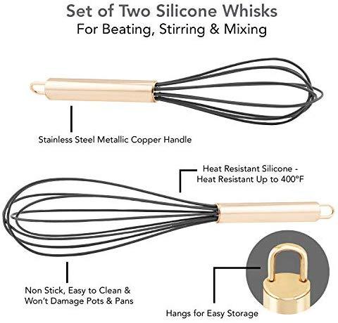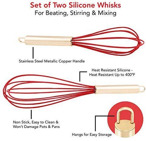 SET INCLUDES – One 10’ whisk and one 12” whisk for beating, stirring and mixing. HIGH PERFORMANCE - Efficiently aerates, blends and quickly beats ingredients creating fluffy eggs and pancakes, superb vinaigrettes and peaked whips and desserts. FLAWLESS DESIGN - Silicone over-mold on the baking whisk wires promotes thorough blending and improved food release. Use with nonstick pans and bakeware to avoid scrapes. Heat resistant up to 400° F. METALLIC AND TRENDY - Gold handle adds color and a modern edge to your décor; keep up with the current styles and trends. Equipped with a hook to conveniently hang these stylish and colorful cooking tools. EASY TO CLEAN – Hand wash with warm soapy water, manual silicone whisks allow for less buildup and mess and are easier to clean and wash.