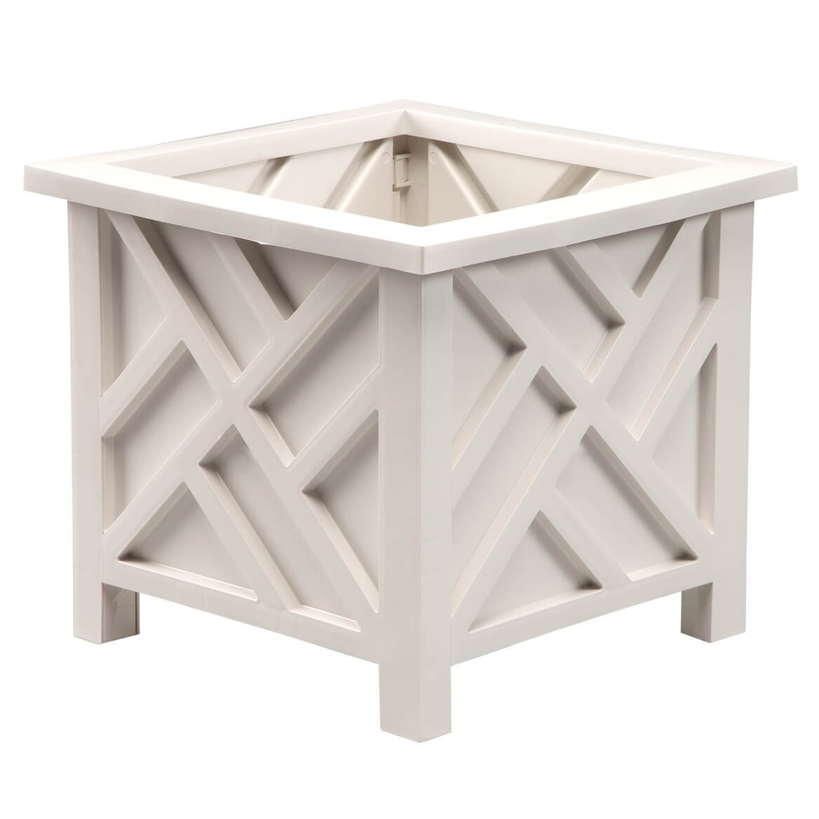 GREAT FOR SHOWCASING YOUR FLOWERS! Set of 2 Chippendale style lattice pattern planter box will enhance your flowers beauty EASY TO USE! No tools needed! Snaps together and snaps apart for storage DURABLE. This outdoor planer is crafted with white polypropylene for weather protection WATER WITHOUT WORRY. Open bottom allows water to drain MEASURES 14 3/4" sq. x 13 1/4" H; 11 1/2" sq. x 11" H interior