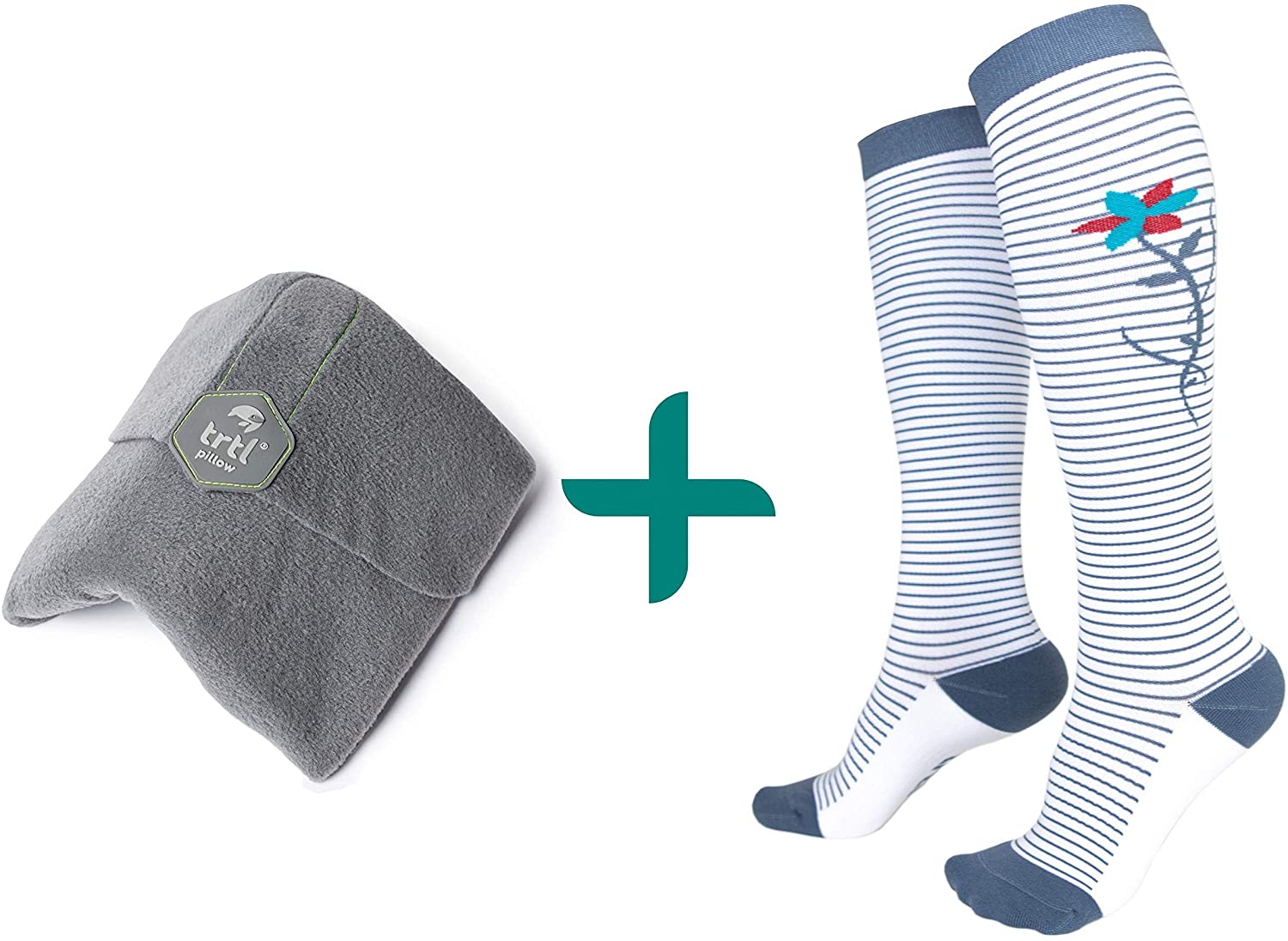 trtl Pillow & Trtl Socks Bundle - Scientifically Proven Super Soft Neck Support Travel Pillow & Trtl Compression Socks (Grey Pillow & Kyoto Socks Size Medium)