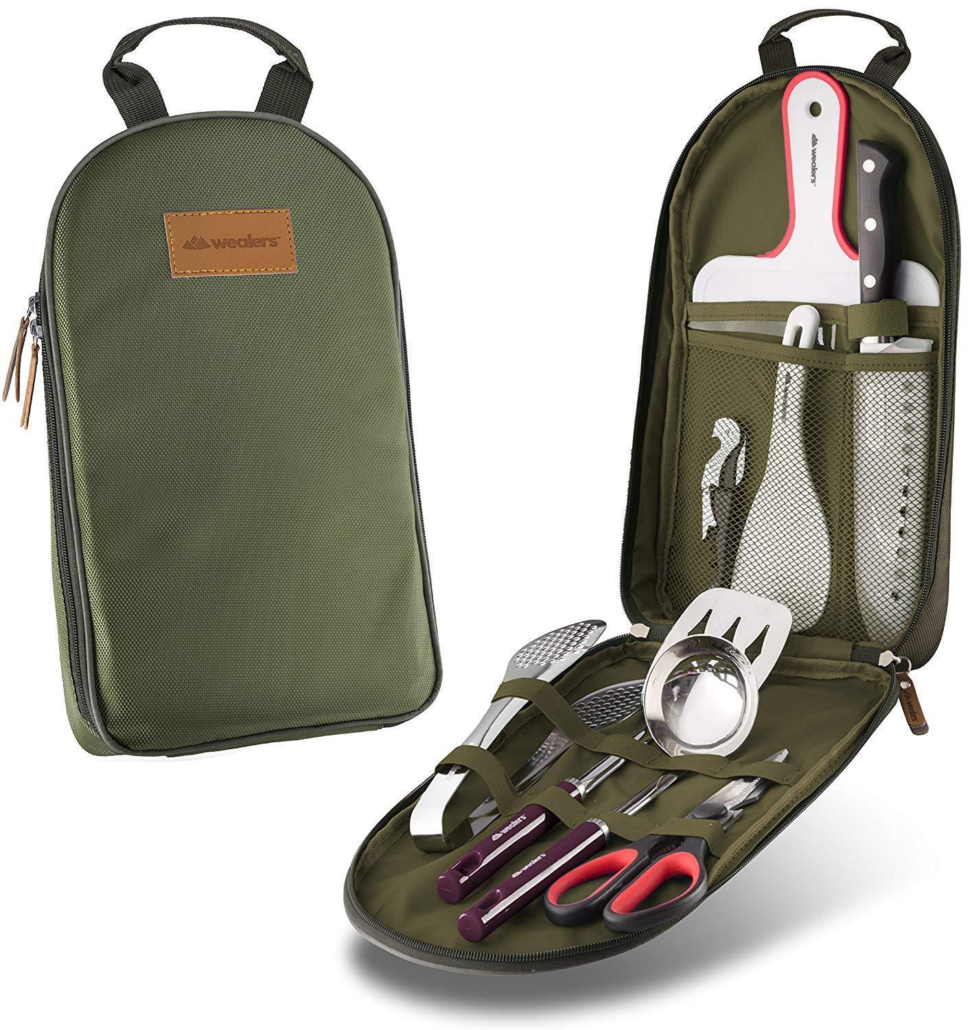 MULTIPURPOSE: The trendy kit can be used for multiple applications, perfect for concerts, sporting events, hiking, boat rides, mountaineering and BBQ’s. The weather retardant the travel utensil kit is the perfect camp kitchen accessory, and it holds all your essential outdoor cooking utensils.