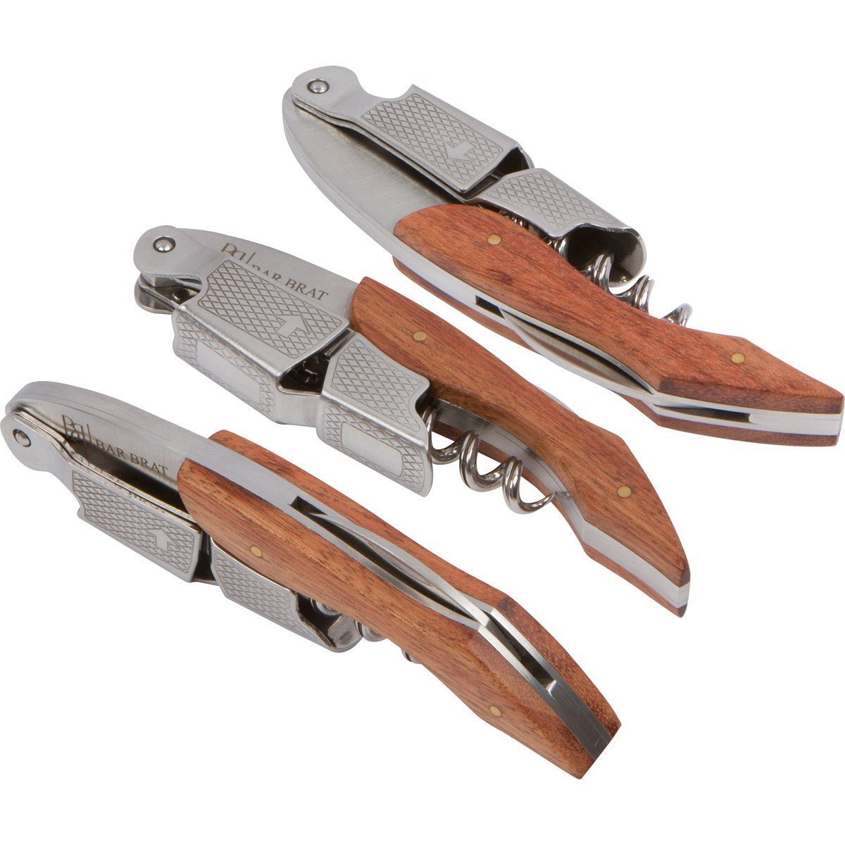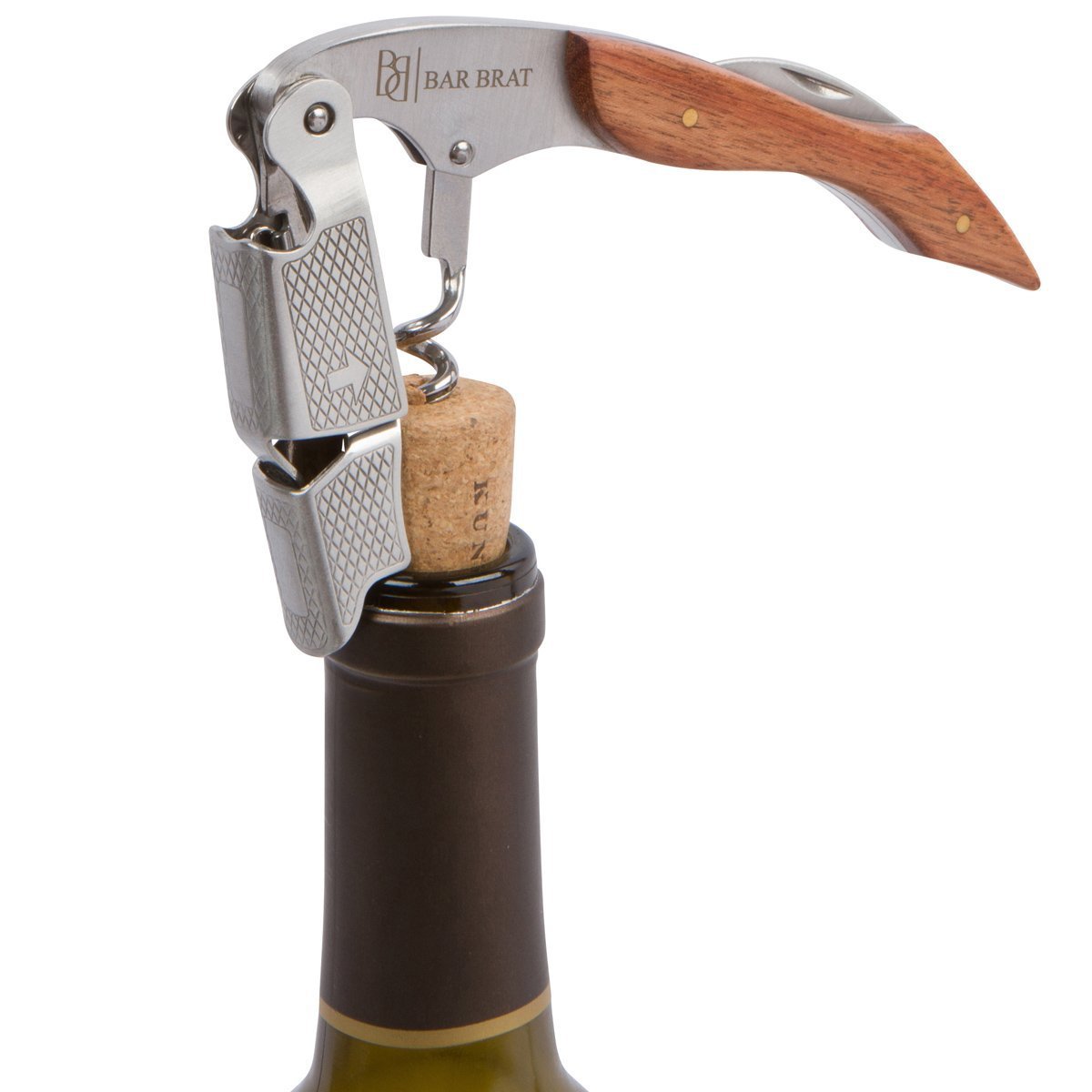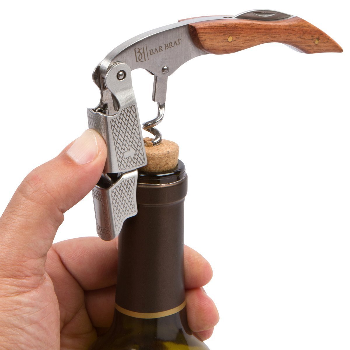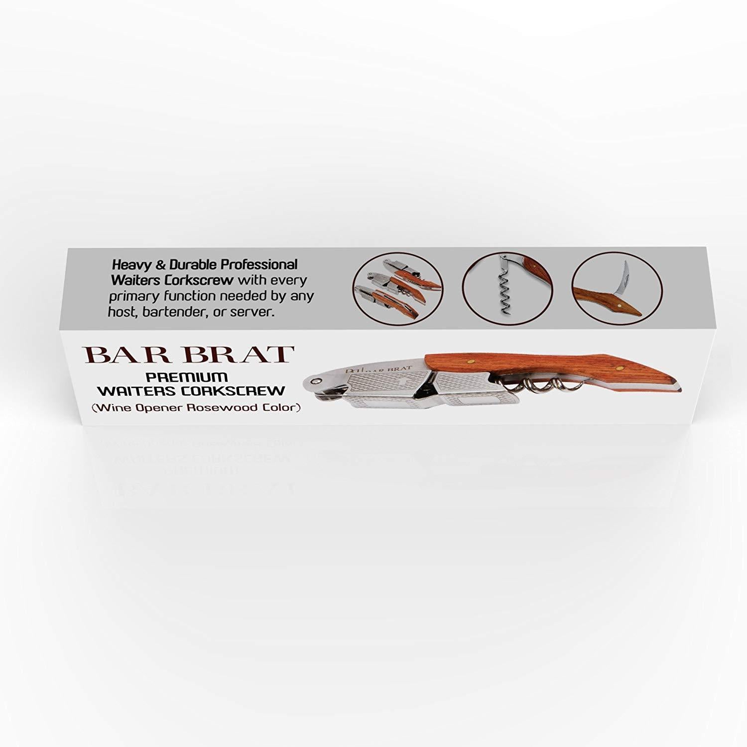 ★ DOUBLE-HINGED FULCRUM (ROSEWOOD) WINE OPENER - 3 In 1 Professional Waiters Corkscrew made of 420 stainless steel with a comfort grip handle making it easy to open wine bottles and beer bottles. When you compare to other wine bottle openers and professional corkscrews, you'll notice the superior difference as this will not break and last as a standard bar accessory for years to come. Features include foil cutter, wine bottle opener, and bottle opener. ★ BEAUTIFULLY ELEGANT CORKSCREW GIFT PACKAGING MAKE THIS THE PERFECT HOLIDAY GIFT - View our images... Our packaging is elegant and makes this wine bottle opener the perfect holiday gift and christmas gift for anyone. ★ COMMERCIAL GRADE WILL LAST OVER 10 YEARS - Built to last (MONEY BACK GUARANTEE), this professional wine opener feels heavy and feels like it will last a long time. With this wine bottle opener, you only need 5 turns and a pull or two to lift most corks out of wine bottles. ★ PERFECT FOR ANY HOME OR RESTAURANT BAR - The Bar Brat Professional Corkscrew will feel like it belongs in your bar. ★ FREE 110 COCKTAIL RECIPE EBOOK INCLUDED & 100% LIFETIME MONEY BACK GUARANTEE - For whatever reason, if our professional corkscrew were to break, we can guarantee we will replace it or return your money...no questions asked.