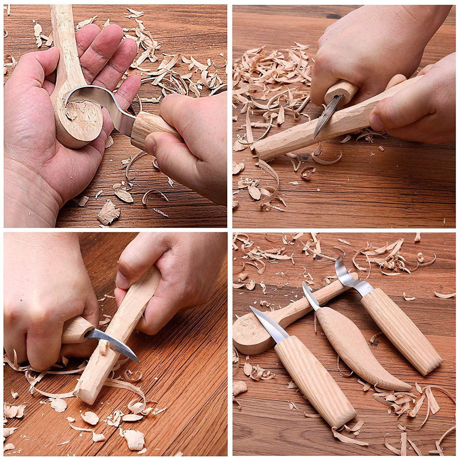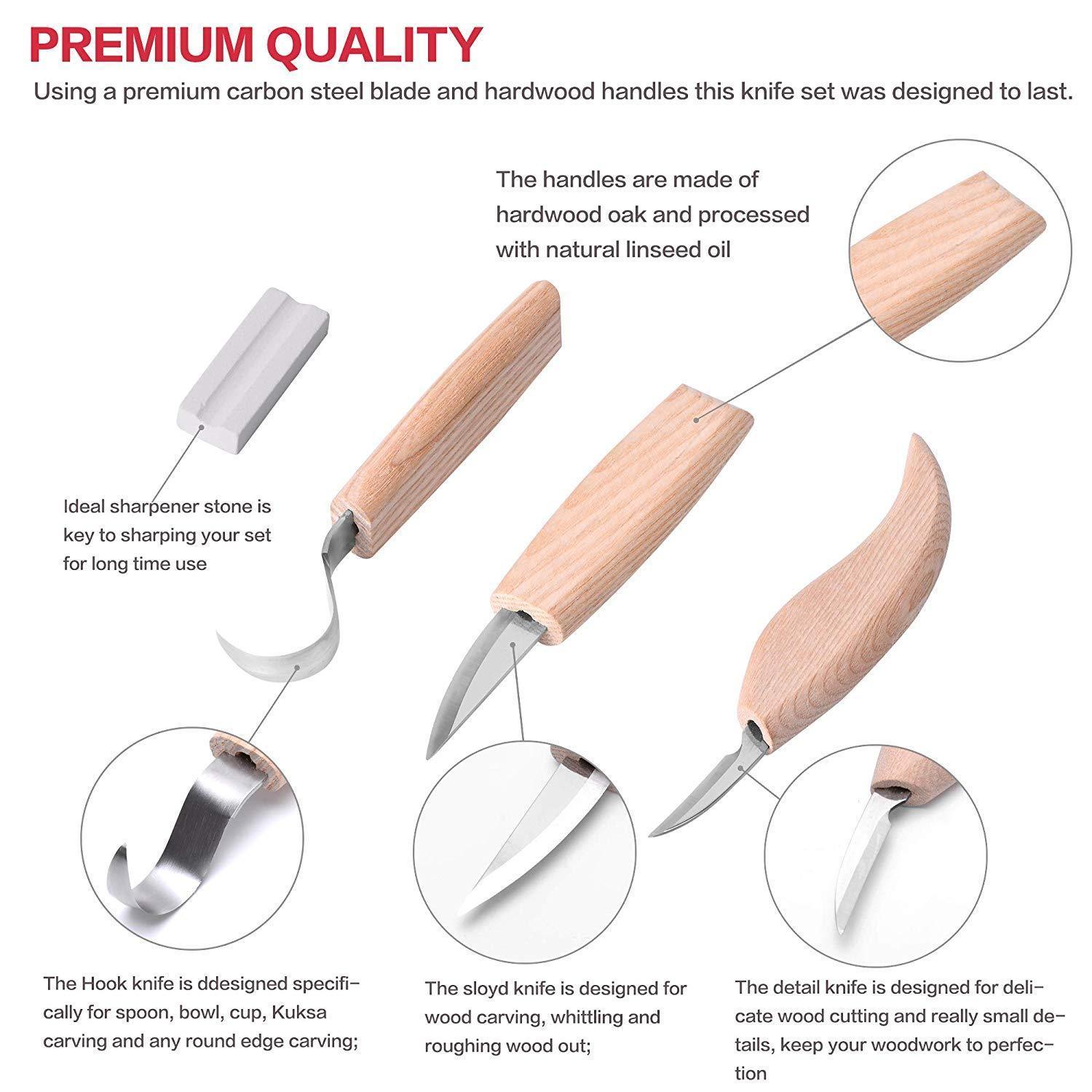 Wood Carving Tool Kit Boy Scout | Sloyd Hook Detail Knives | Hardwood Handle Grips Carbide Blades, Bonus Sharpener Included All Inclusive 4 Piece Set