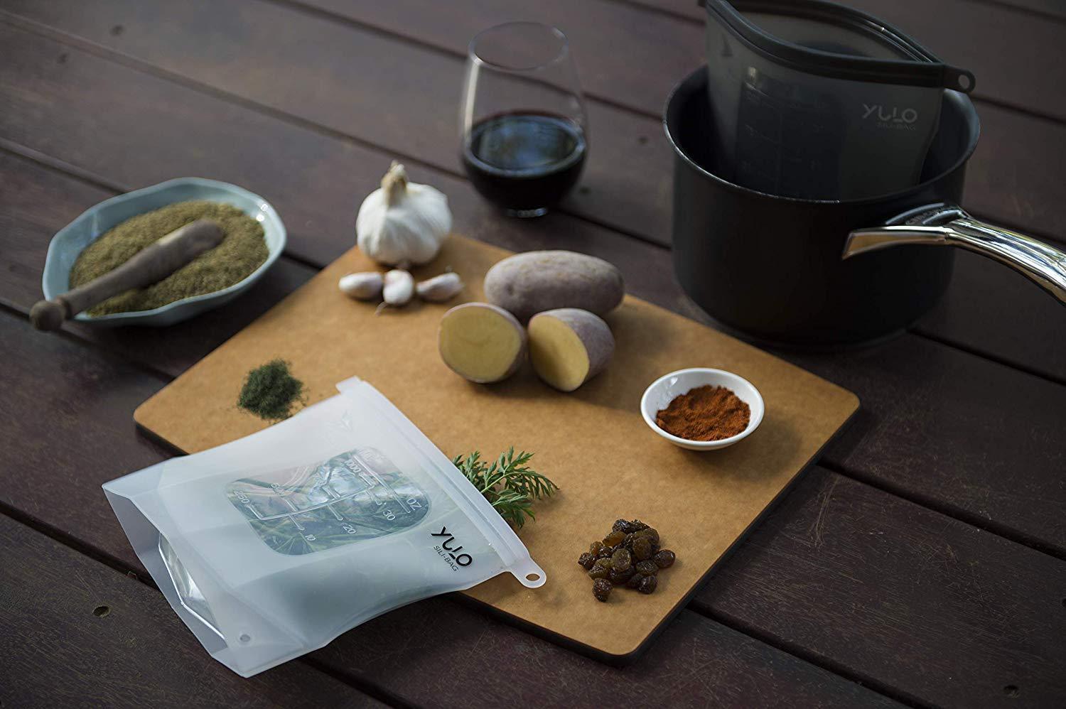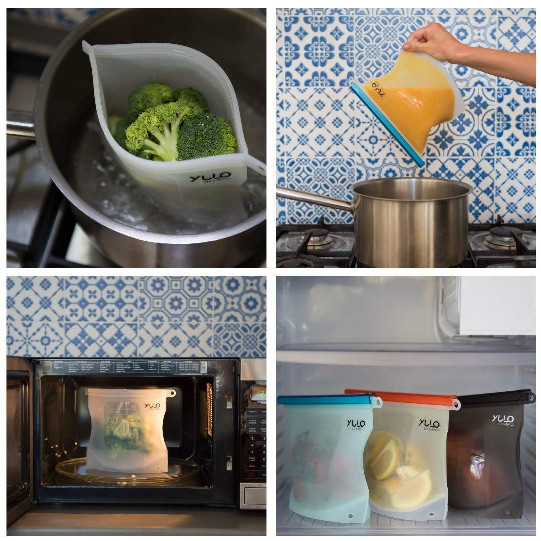 PACK OF 5 SILICONE BAGS REUSABLE β 5 large (33 fl. Oz : 1L : 4 cups) reusable silicone food storage bag (8.67β x 6.89β). Great size that easily fits a sandwich and makes meal prep and food storage a breeze! π± UNIQUE DESIGN & EASY TO USE β Yulo Sili-Bags reusable lunch bags unique design means your bags will be stronger and easier to use than the rest. The sleek, ergonomic, concave design makes it easier to use the bags and keeps them staying upright more efficiently when stored or in use. The sliding bar tightly seals your bag and means absolute freshness, just make sure theyβre properly closed right to the end and slide the arrows on the bar and on the bag in the same direction. βοΈ FREEZER, MICROWAVE AND DISHWASHER SAFE β Yulo Sili-Bags reusable food storage bags multi-purpose reusable containers are super versatile and can be used in the freezer, microwave, for steaming, sous vide cooking, just about a bag for any kind of use! Why not take it on the plane, or as a toiletries bag? With so many uses weβll leave you to enjoy and create even more uses for your Yulo Sili-Bag.